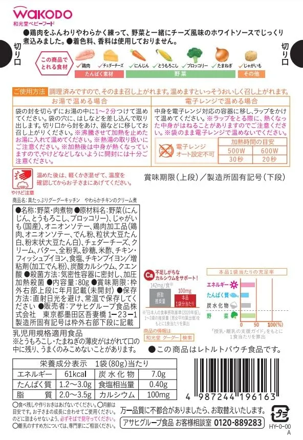 ・バラエティ豊かな「具」がたっぷり ・離乳食で不足しがちな鉄もしくはカルシウムを強化 ・鶏肉をふんわりやわらかく練って、野菜と一緒にチーズ風味のホワイトソースでじっくり煮込みました。