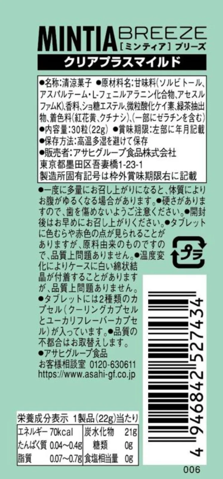 ・一度に多量にお召し上がりになると、体質によりお腹がゆるくなる場合があります。・硬さがありますので、歯を傷めないようご注意ください。・開封後はお早めにお召し上がりください。・タブレットに色むらや赤色の点が見られることがありますが、原料由来のものですので品質上問題ありません。・温度変化によりケースに白い綿状結晶が付着することがありますが、品質上問題ありません。・タブレットには2種類のカプセル(クーリングカプセルとユーカリフレーバーカプセル)が入っています。・不都合品はお取替えいたします。