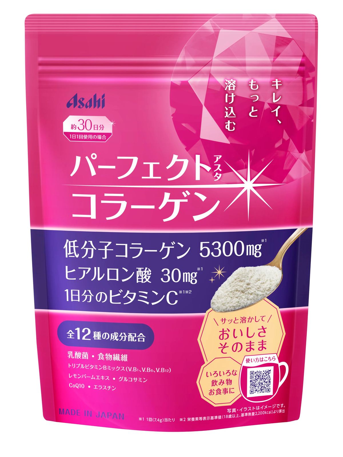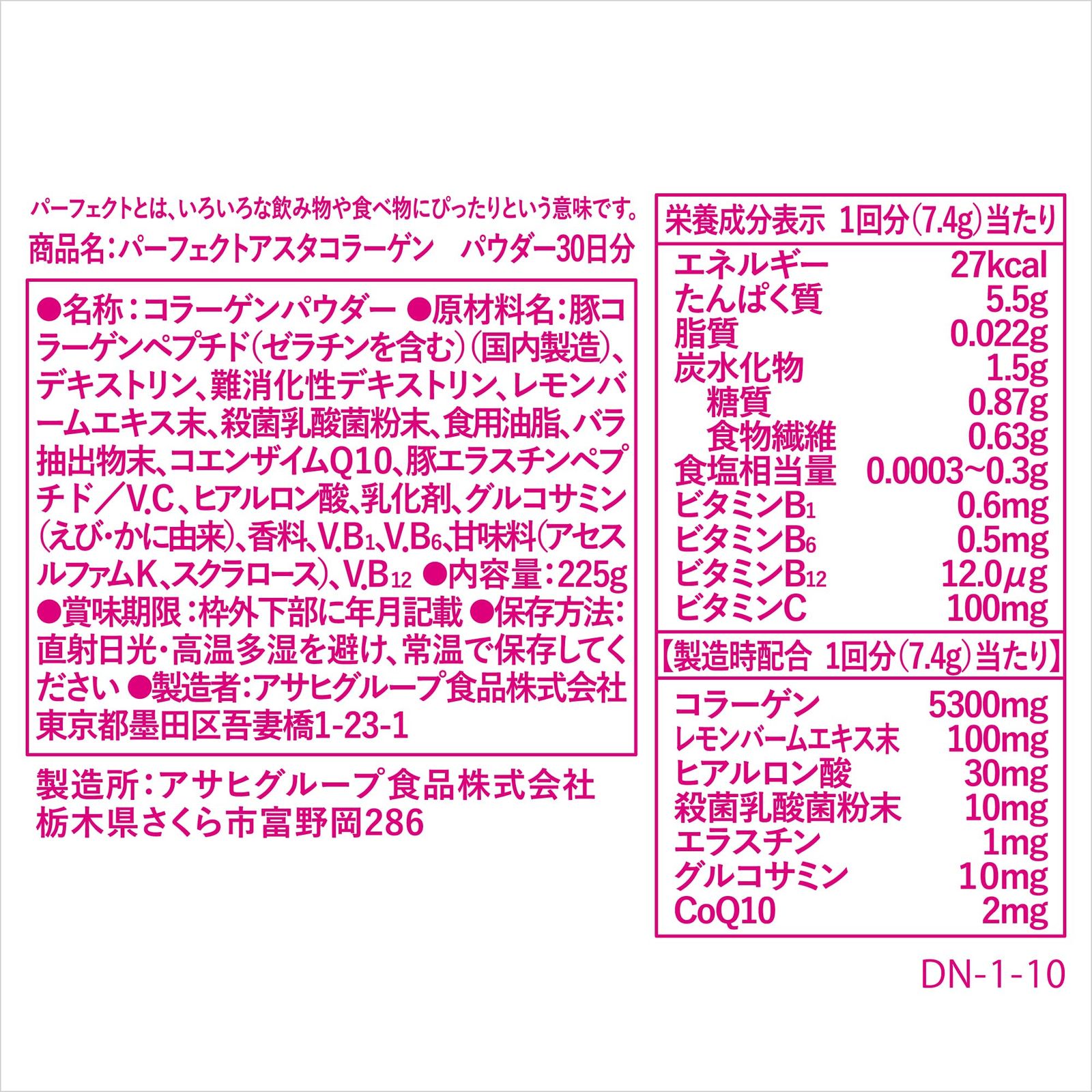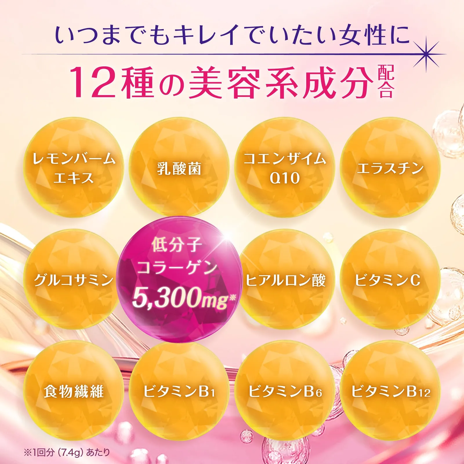豚コラーゲンペプチド(ゼラチンを含む)(国内製造)、デキストリン、難消化性デキストリン、レモンバームエキス末、殺菌乳酸菌粉末、食用油脂、バラ抽出物末、コエンザイムQ10、豚エラスチンペプチド/V.C、ヒアルロン酸、乳化剤、グルコサミン(えび・かに由来)、香料、V.B1、V.B6、甘味料(アセスルファムK、スクラロース)、V.B12