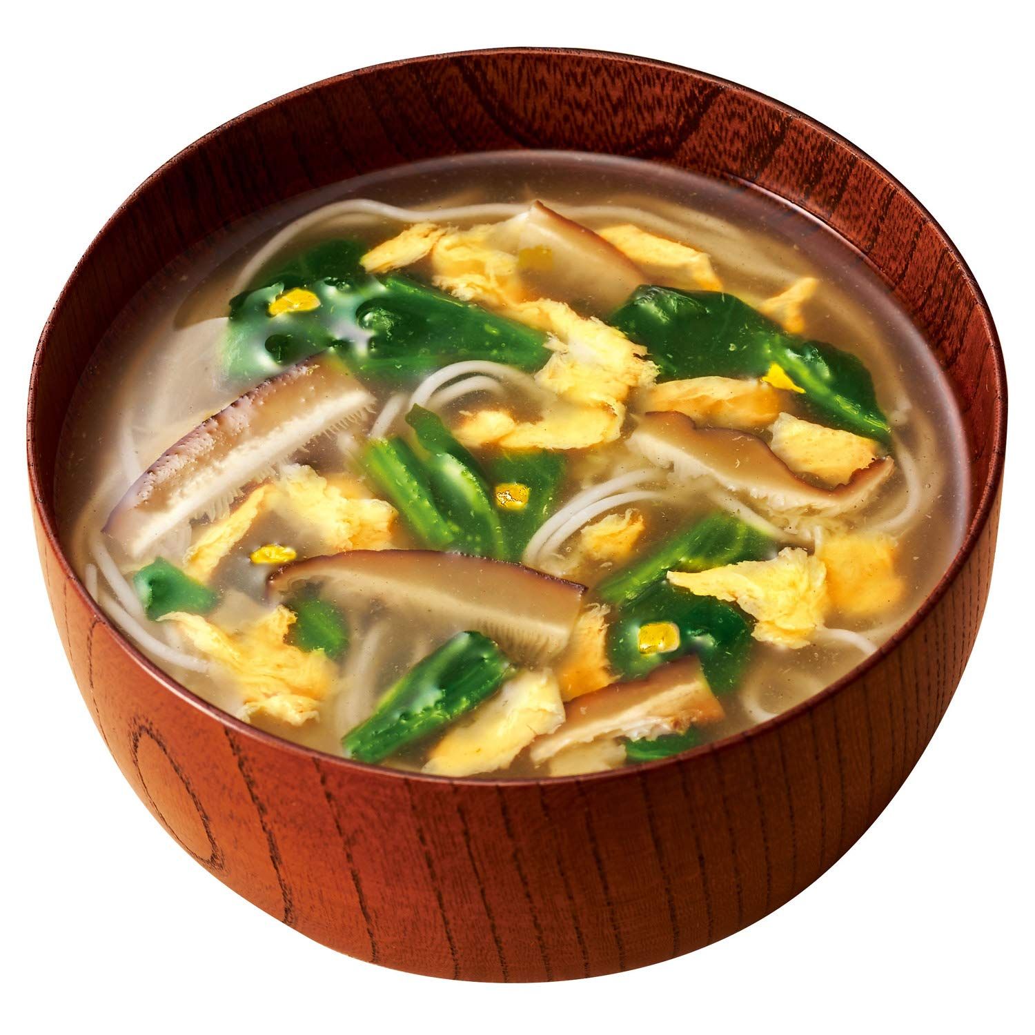 具材には、ほうれん草、かき卵、椎茸、柚子入り。お湯を注ぐとふんわりかき卵とほうれん草がふわっと広がります。