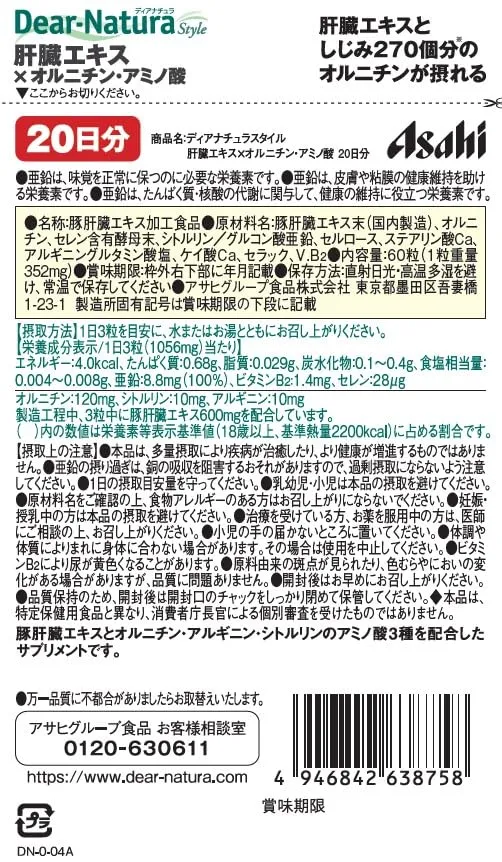 豚肝臓エキス末(国内製造)、オルニチン、セレン含有酵母末、シトルリン/グルコン酸亜鉛、セルロース、ステアリン酸Ca、アルギニングルタミン酸塩、ケイ酸Ca、セラック、V.B2