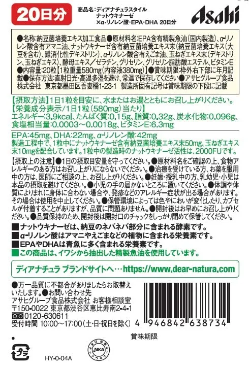 ナットウキナーゼ:2000FU(製造時活性)、α-リノレン酸(えごま油、アマニ油由来):10mg、EPA:45mg、DHA:22mg、玉ねぎエキス:10mg、ビタミンE:6.3mg