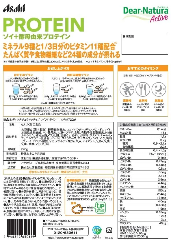 大豆蛋白(国内製造)、酵母細胞壁末、ココアパウダー、デキストリン、ドロマイト、水溶性食物繊維、パン酵母末、大豆ペプチド、食塩、有胞子性乳酸菌末、HMBカルシウム、植物油脂、乳化剤、炭酸Ca、香料、甘味料(アスパルテーム・L-フェニルアラニン化合物、カンゾウ、スクラロース、アセスルファムK)、V.C、糊料(グァー)、ピロリン酸鉄、V.E、パントテン酸Ca、V.A、ナイアシン、V.B6、V.B2、V.B1、葉酸、V.D、V.B12
