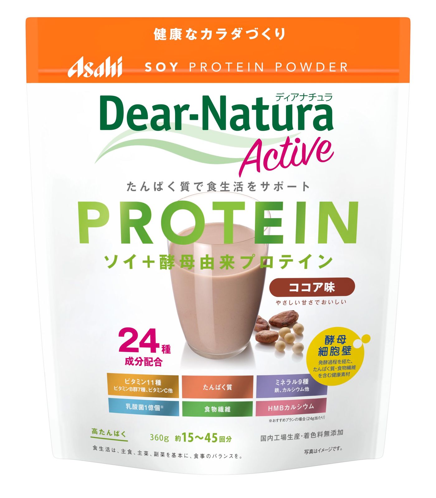 大豆蛋白(国内製造)、酵母細胞壁末、ココアパウダー、デキストリン、ドロマイト、水溶性食物繊維、パン酵母末、大豆ペプチド、食塩、有胞子性乳酸菌末、HMBカルシウム、植物油脂、乳化剤、炭酸Ca、香料、甘味料(アスパルテーム・L-フェニルアラニン化合物、カンゾウ、スクラロース、アセスルファムK)、V.C、糊料(グァー)、ピロリン酸鉄、V.E、パントテン酸Ca、V.A、ナイアシン、V.B6、V.B2、V.B1、葉酸、V.D、V.B12