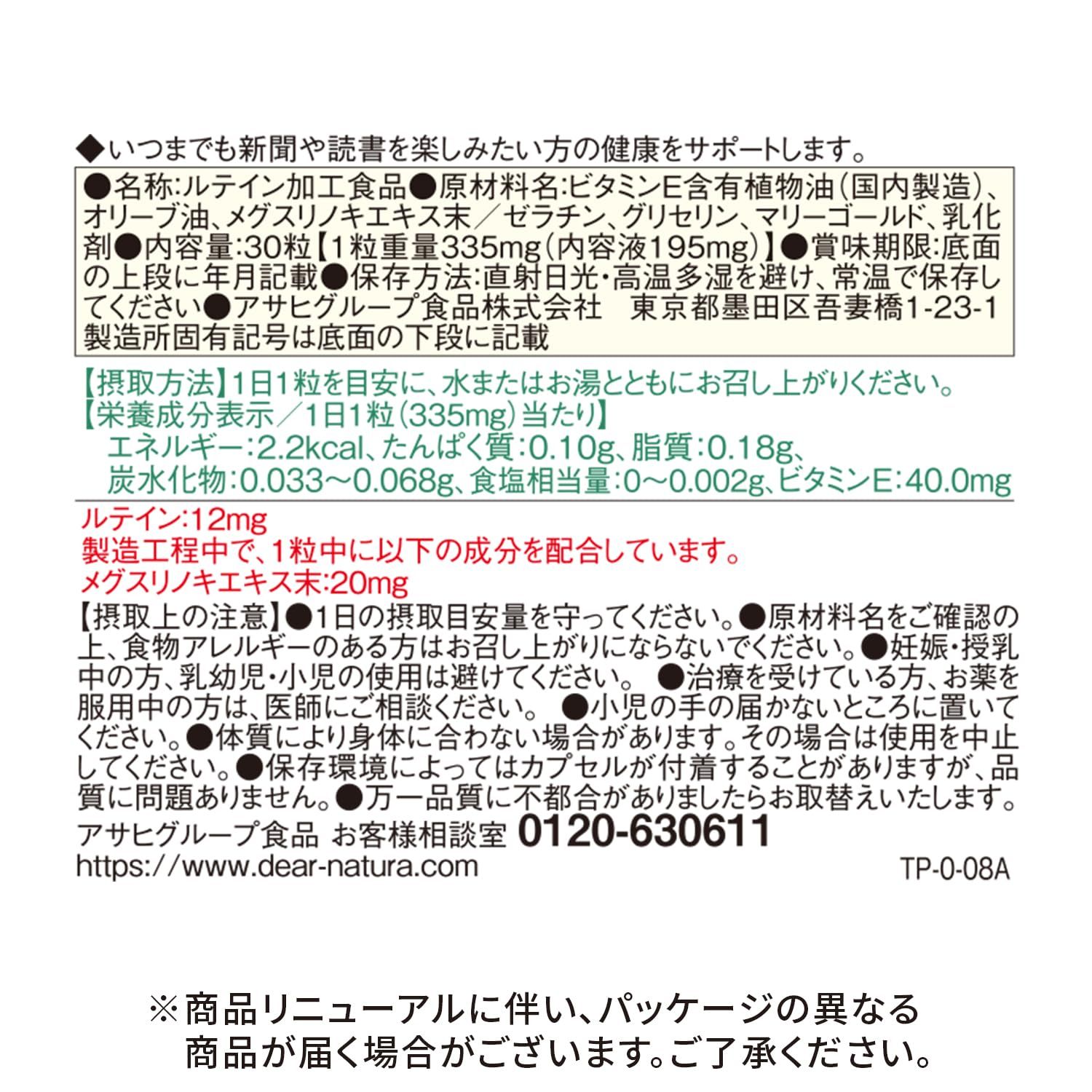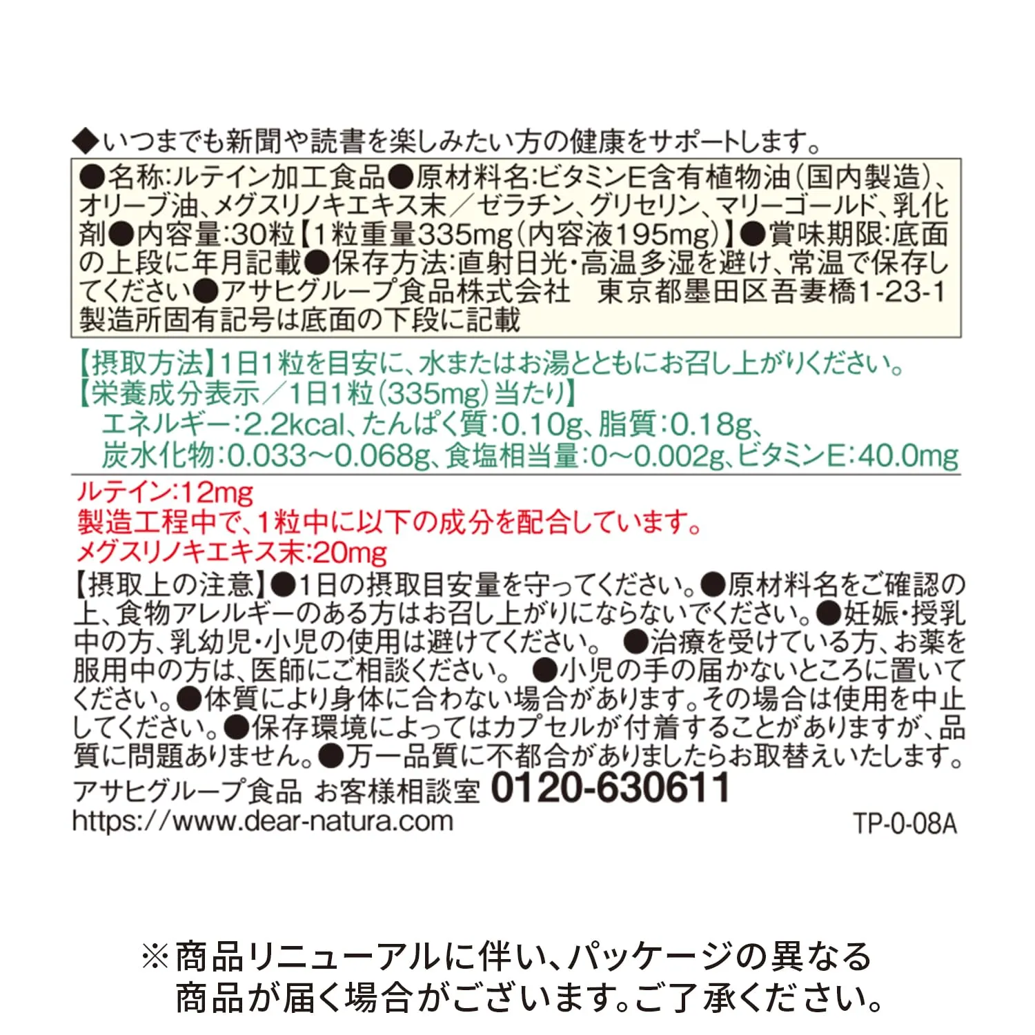 ビタミンE:40mg、ルテイン:12mg、メグスリノキエキス末:20mg