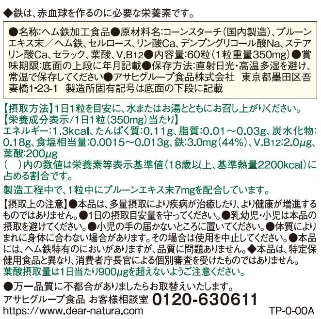 コーンスターチ(国内製造)、プルーンエキス末、ヘム鉄、セルロース、リン酸Ca、デンプングリコール酸Na、ステアリン酸Ca、セラック、葉酸 V.B12