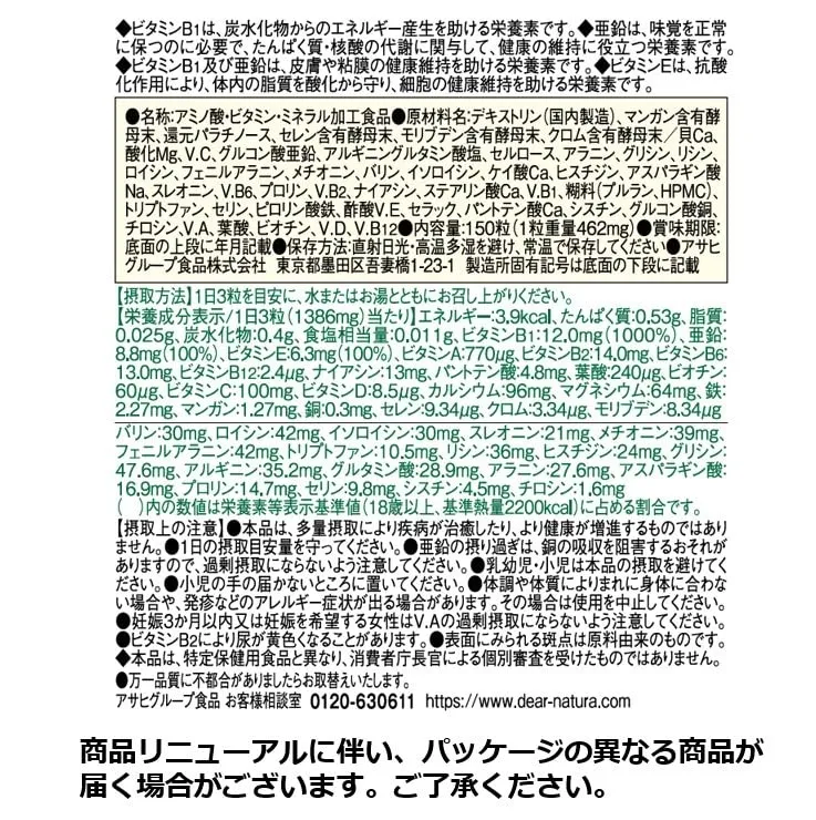 デキストリン、マンガン含有酵母、還元パラチノース、セレン含有酵母、モリブテン含有酵母、クロム含有酵母/貝Ca、酸化Mg、V.C、グルコン酸亜鉛、アルギニングルタミン酸塩、セルロース、アラニン、グリシン、リシン塩酸塩、ロイシン、フェニルアラニン、メチオニン、バリン、イソロイシン、ケイ酸Ca、ヒスチジン、アスパラギン酸Na、スレオニン、V.B6、プロリン、V.B2、ナイアシン、ステアリン酸Ca、V.B1、糊料(プルラン、HPMC)、トリプトファン、セリン、ピロリン酸鉄、酢酸V.E、セラック、パントテン酸Ca、シスチン、グルコン酸銅、チロシン、V.A、葉酸、ビオチン、V.D、V.B12(一部に乳成分を含む)