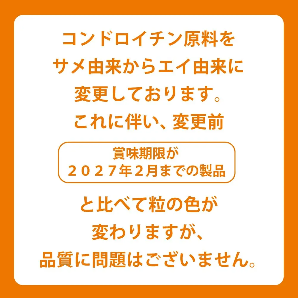 コンドロイチン含有エイ軟骨抽出物末(国内製造)、Ⅱ型コラーゲン含有鶏軟骨エキス末、還元パラチノース、メチルスルフォニルメタン、デキストリン/グルコサミン(えび・かに由来)、貝Ca、糊料(HPMC)、HPC、酸化Mg、ステアリン酸Ca、ヒアルロン酸、フィチン酸、V.D