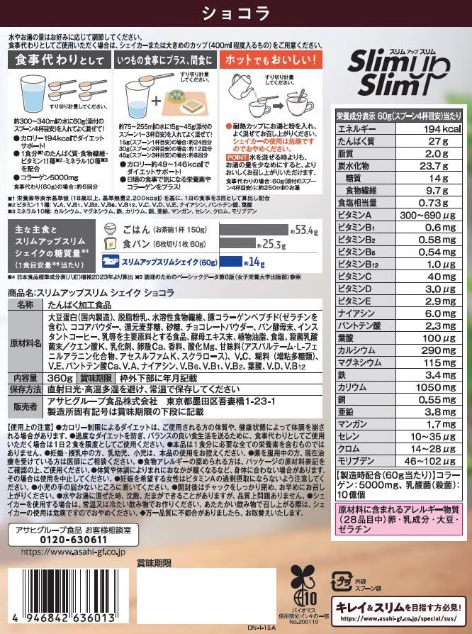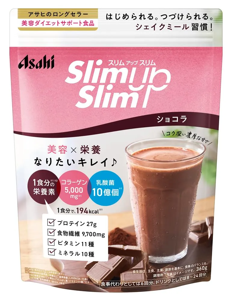 大豆蛋白(国内製造)、脱脂粉乳、水溶性食物繊維、乳蛋白、豚コラーゲンペプチド(ゼラチンを含む)、ココアパウダー、還元麦芽糖、砂糖、チョコレートパウダー、パン酵母末、インスタントコーヒー、酵母エキス末、殺菌乳酸菌末、植物油脂/クエン酸K、乳化剤、香料、酸化Mg、甘味料(アスパルテーム・L-フェニルアラニン化合物、アセスルファムK、スクラロース)、卵殻Ca、V.C、糊料(増粘多糖類)、V.E、ピロリン酸第二鉄、パントテン酸Ca、V.A、ナイアシン、V.B6、V.B1、V.B2、葉酸、V.D、V.B12