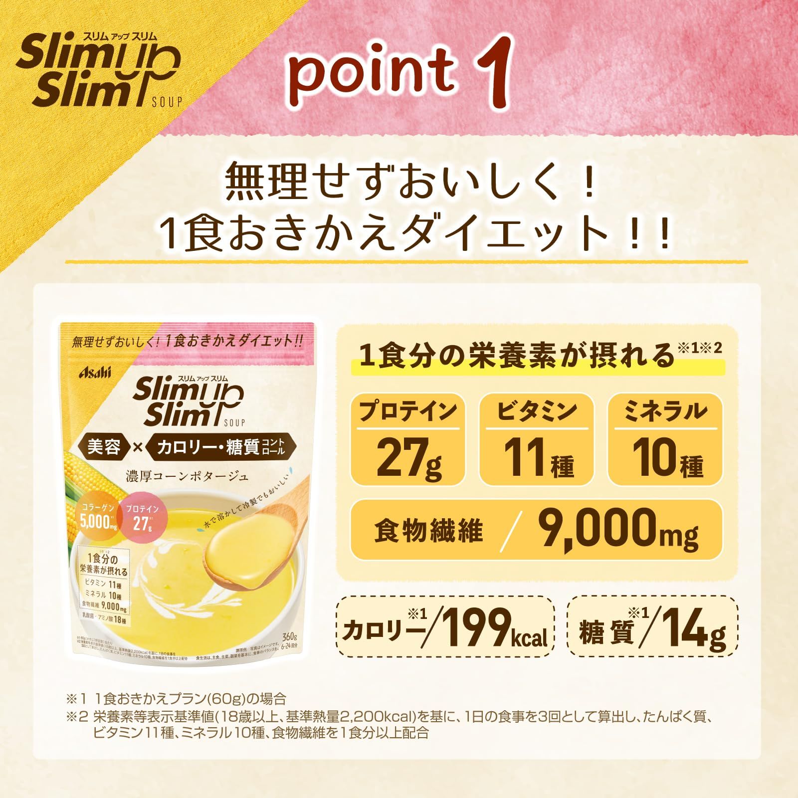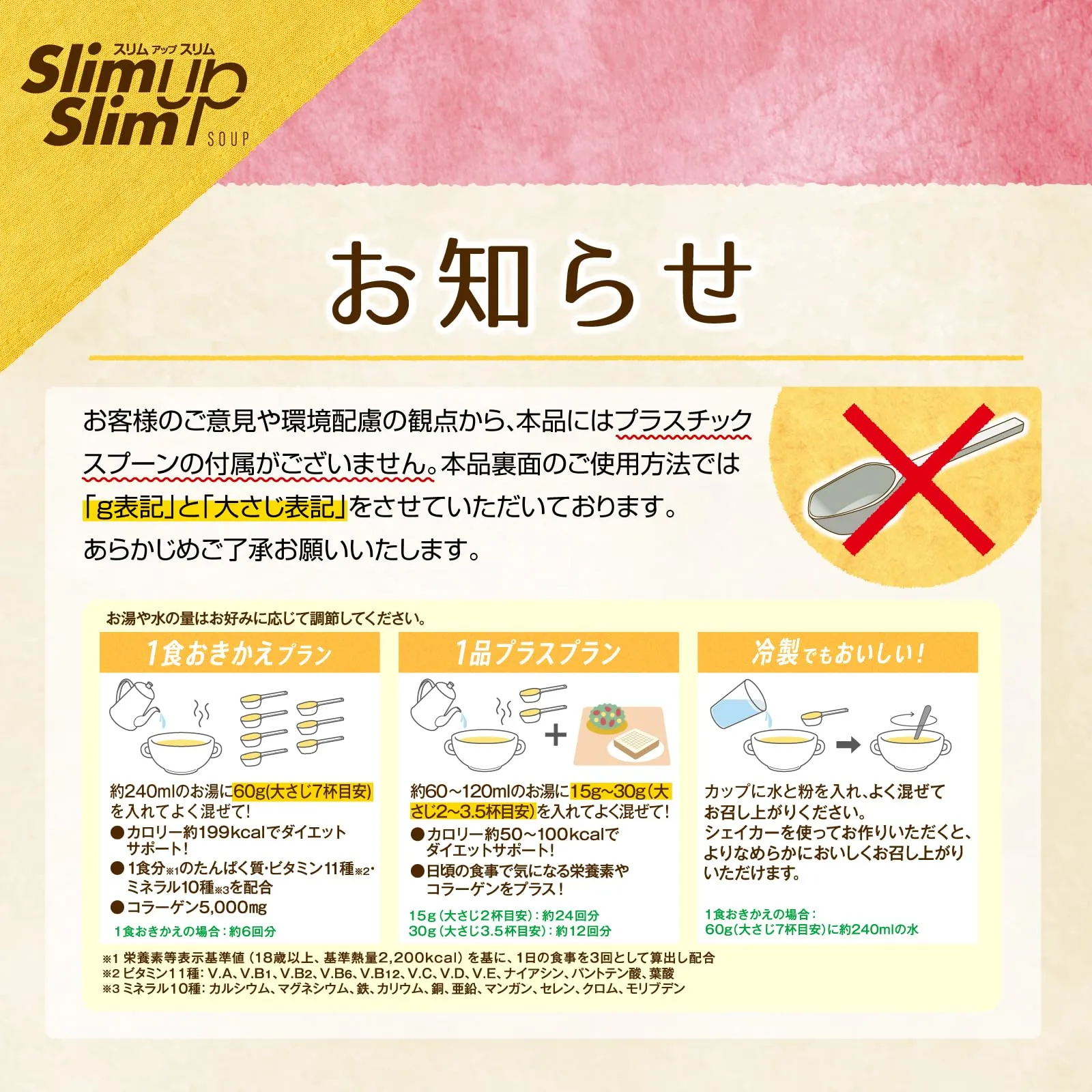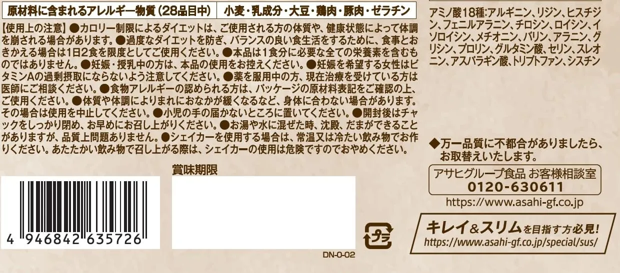 乳蛋白(フランス製造、デンマーク製造)、大豆蛋白、水溶性食物繊維、コーンパウダー、豚コラーゲンペプチド(ゼラチンを含む)、脱脂粉乳、食塩、でん粉、チキンエキスパウダー(小麦を含む)、ドロマイト、オニオンエキスパウダー、パン酵母末、チーズ加工品、たん白加水分解物(豚肉を含む)、食用油脂、乳等を主要原料とする食品、酵母エキス末、香辛料、殺菌乳酸菌末、具(乾燥コーン)/調味料(アミノ酸等)、クエン酸K、グルコン酸K、糊料(キサンタン)、乳化剤、香料、V.C、クチナシ色素、甘味料(スクラロース、アセスルファムK、カンゾウ)、V.E、ピロリン酸第二鉄、パントテン酸Ca、V.A、酸味料、ナイアシン、V.B6、V.B1、V.B2、葉酸、V.D、V.B12