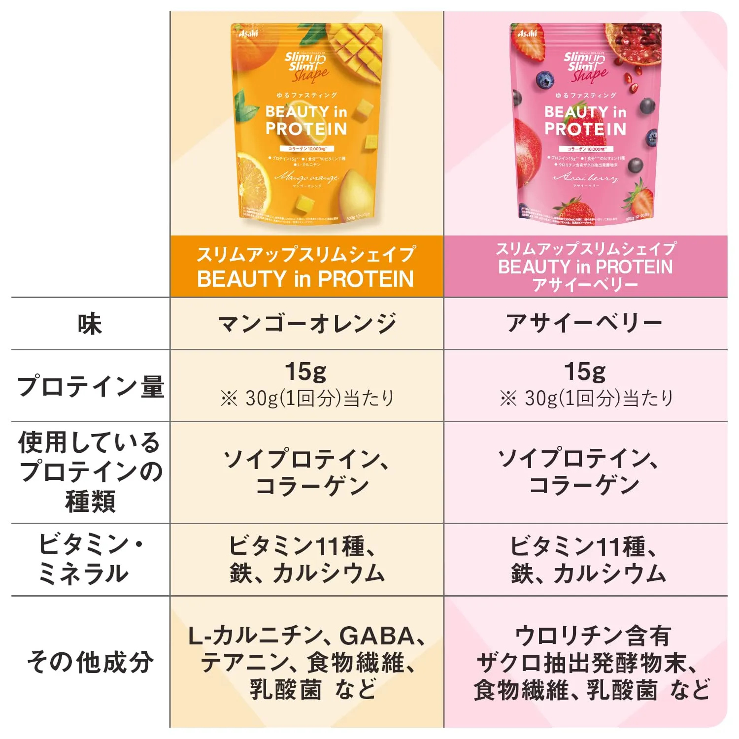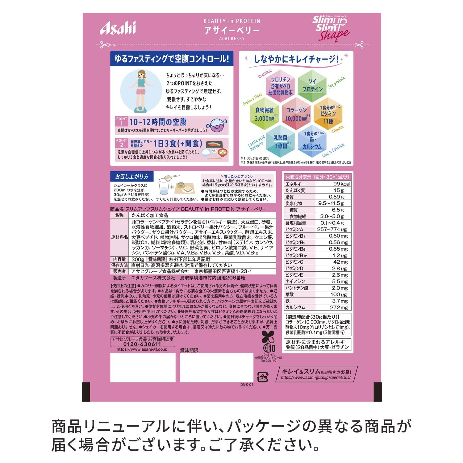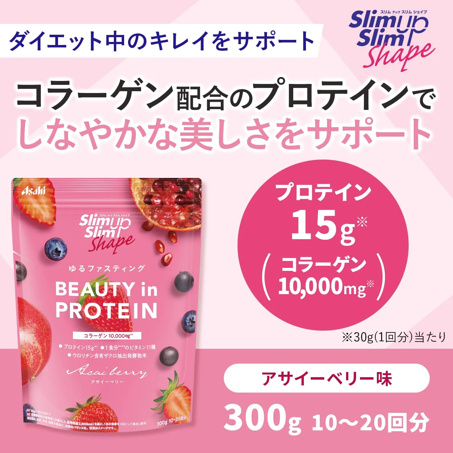 商品紹介 スリムアップスリムシェイプ BEAUTY in PROTEIN アサイーベリー 300g 粉末 プロテイン アサヒグループ食品 原材料・成分 スリムアップスリムシェイプ BEAUTY in PROTEIN アサイーベリー 300g 粉末 プロテイン アサヒグループ食品 使用方法 1回分(30g)を15gの水に溶かし、1回分(30g)を15gの水に溶かしたものを合わせて飲みます。