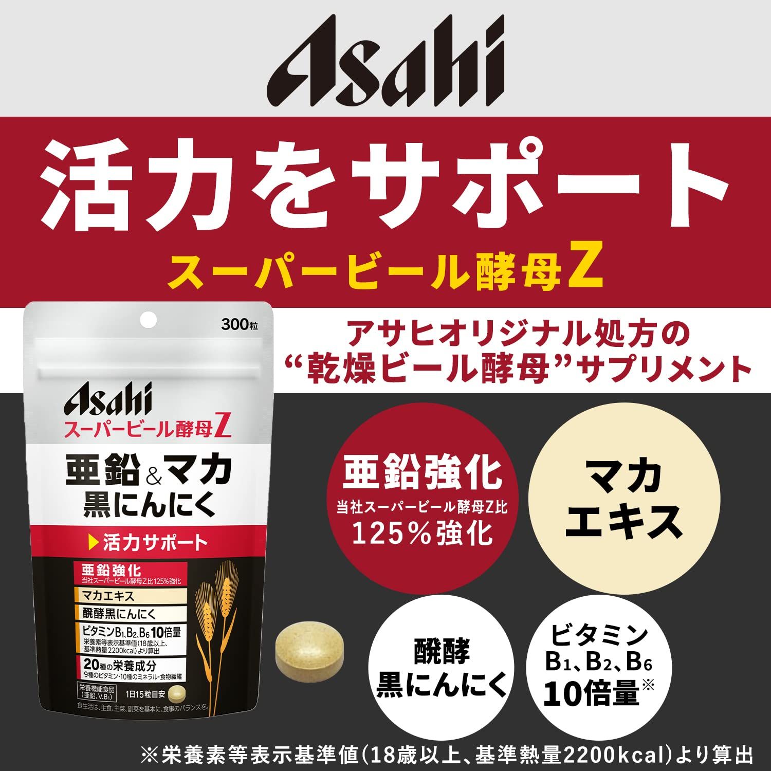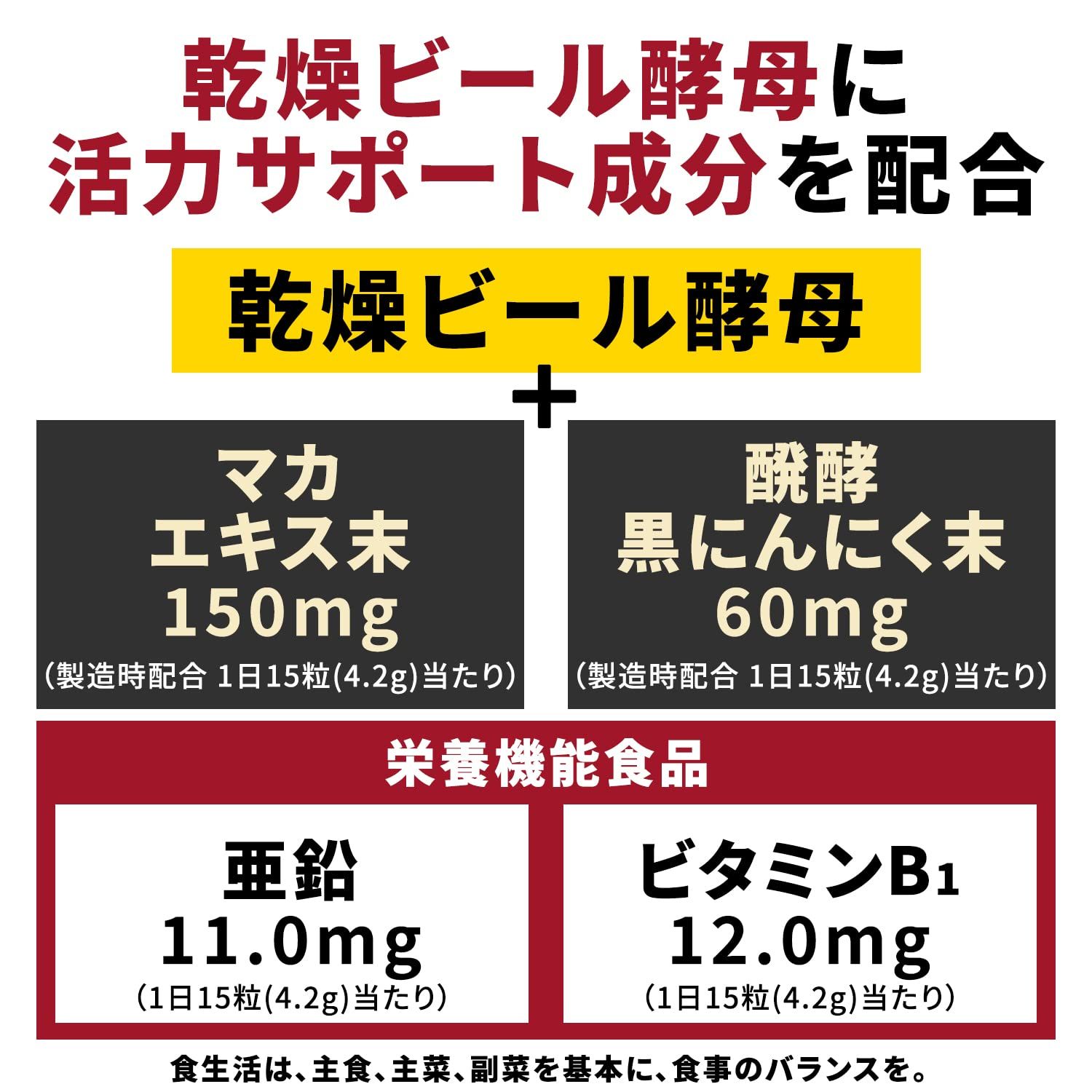 ●乾燥ビール酵母にマカエキス、醗酵黒にんにくを配合。