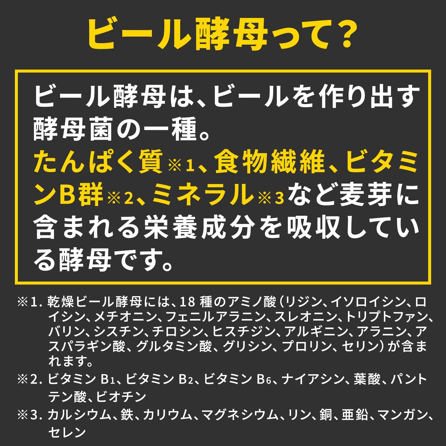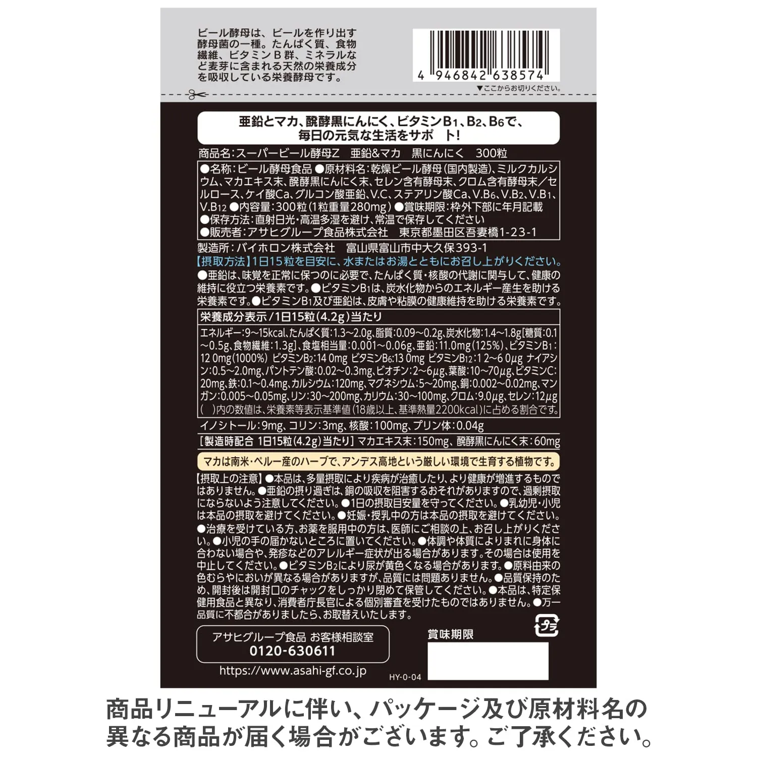 乾燥ビール酵母(国内製造)、ミルクカルシウム、マカエキス末、醗酵黒にんにく末、セレン含有酵母末、クロム含有酵母末/セルロース、ケイ酸Ca、グルコン酸亜鉛、V.C、ステアリン酸Ca、V.B6、V.B2、V.B1、V.B12