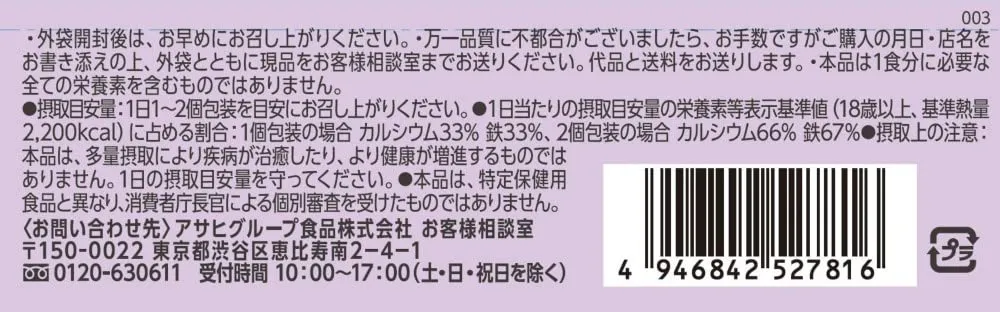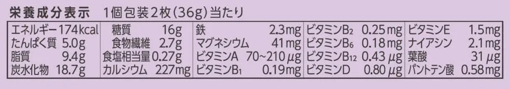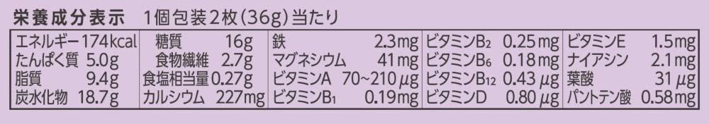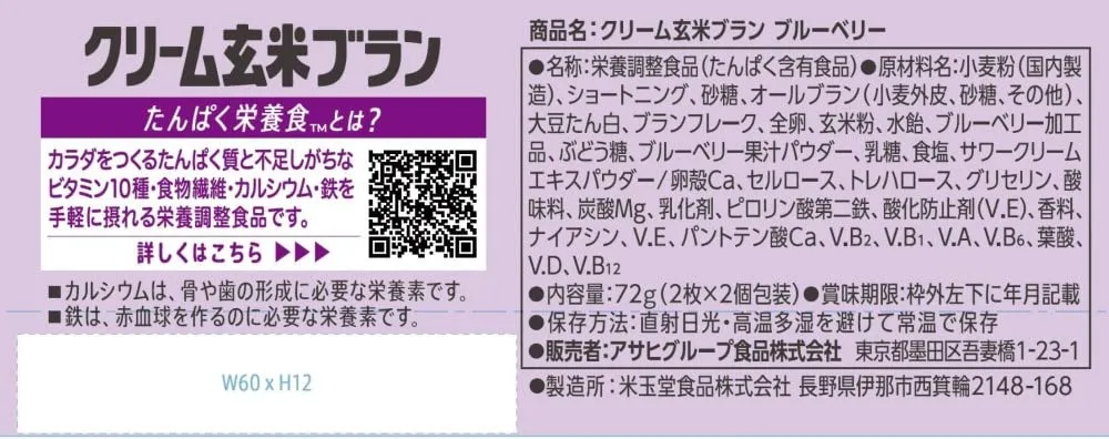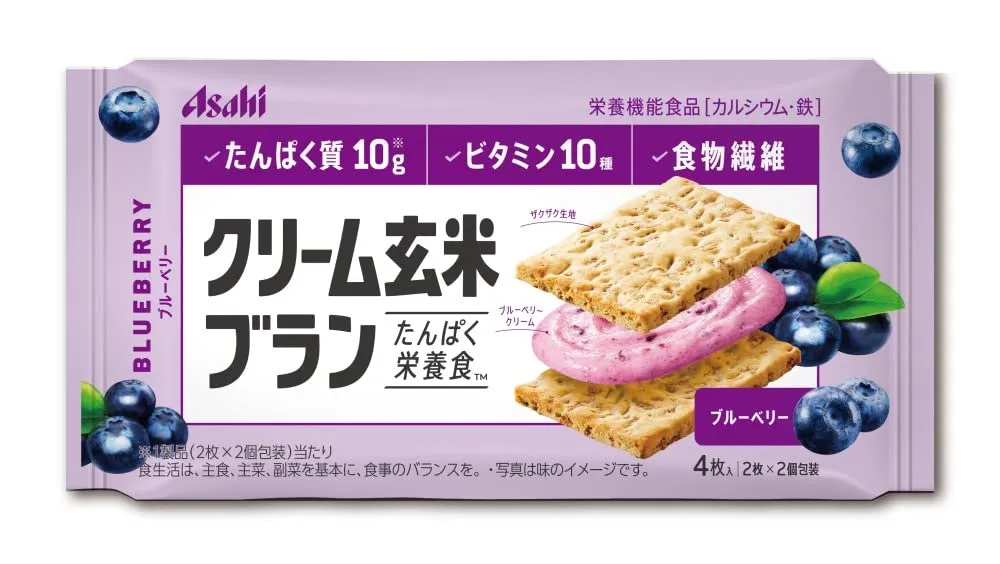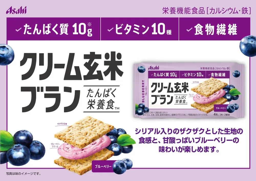 「小麦ブラン」と「玄米」を、おいしく食べやすくしたクリームサンドタイプの栄養調整食品です。ブルーベリークリームを、玄米・小麦ブランを練り込んだザクザク香ばしい生地でサンドしました。たんぱく質10g(1製品当たり)、ビタミン10種、食物繊維、カルシウム、鉄を配合。