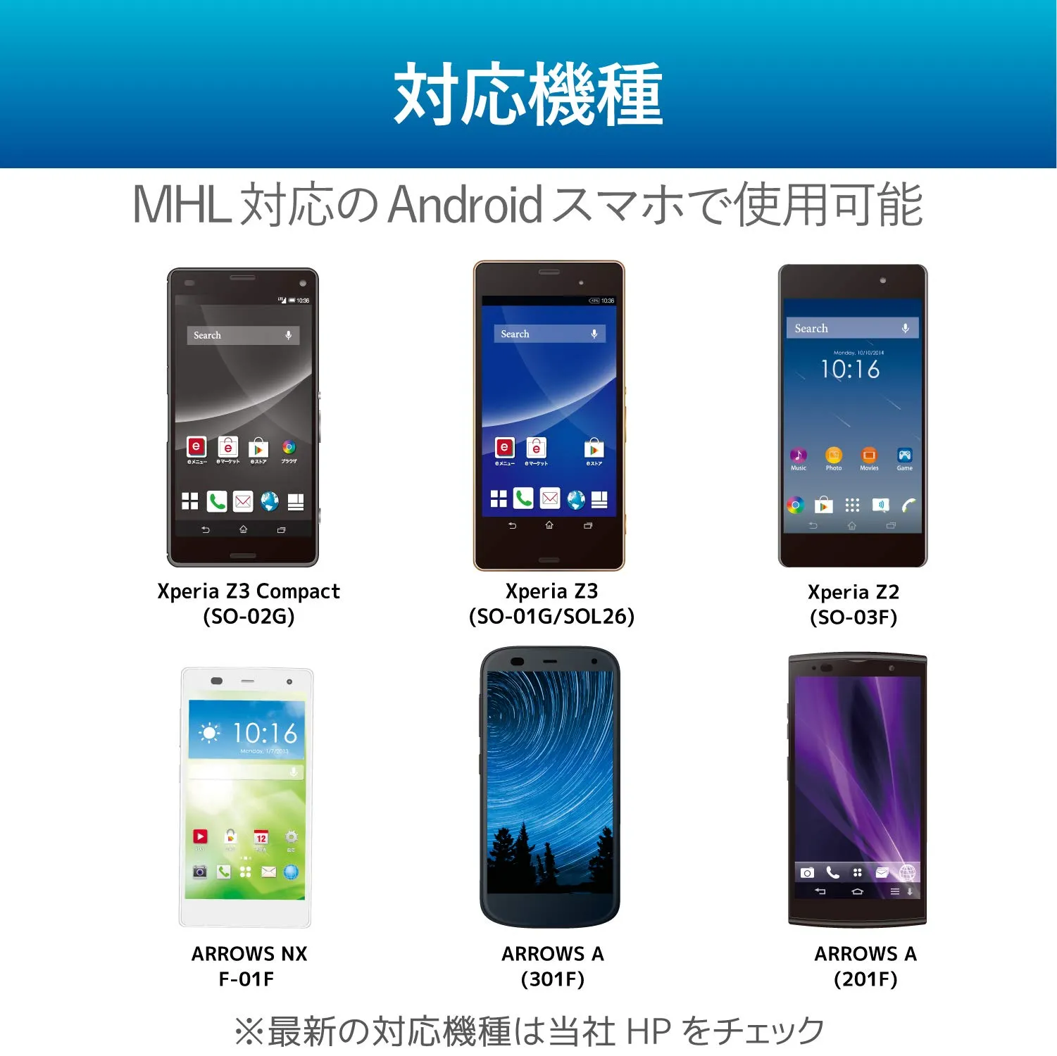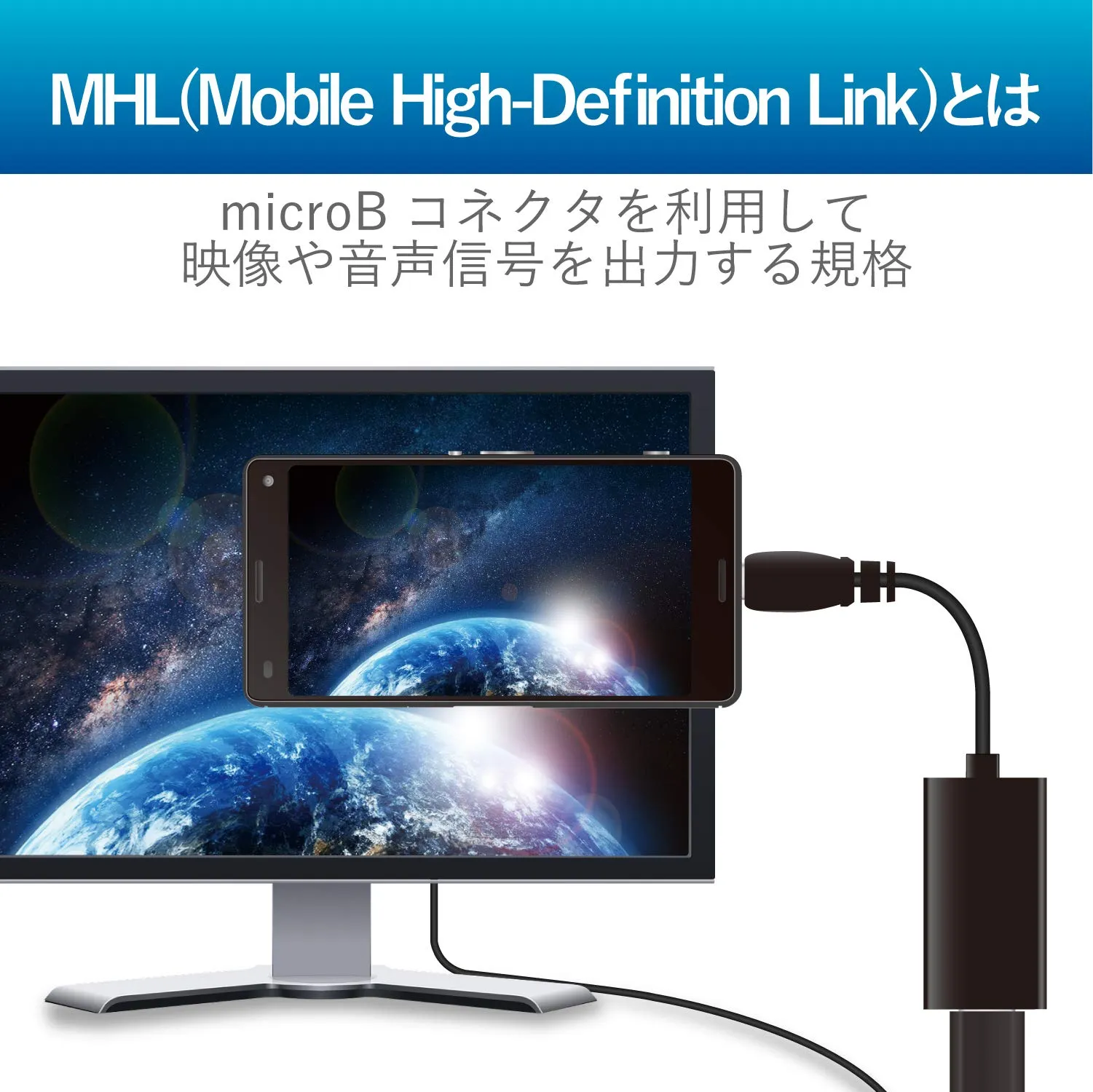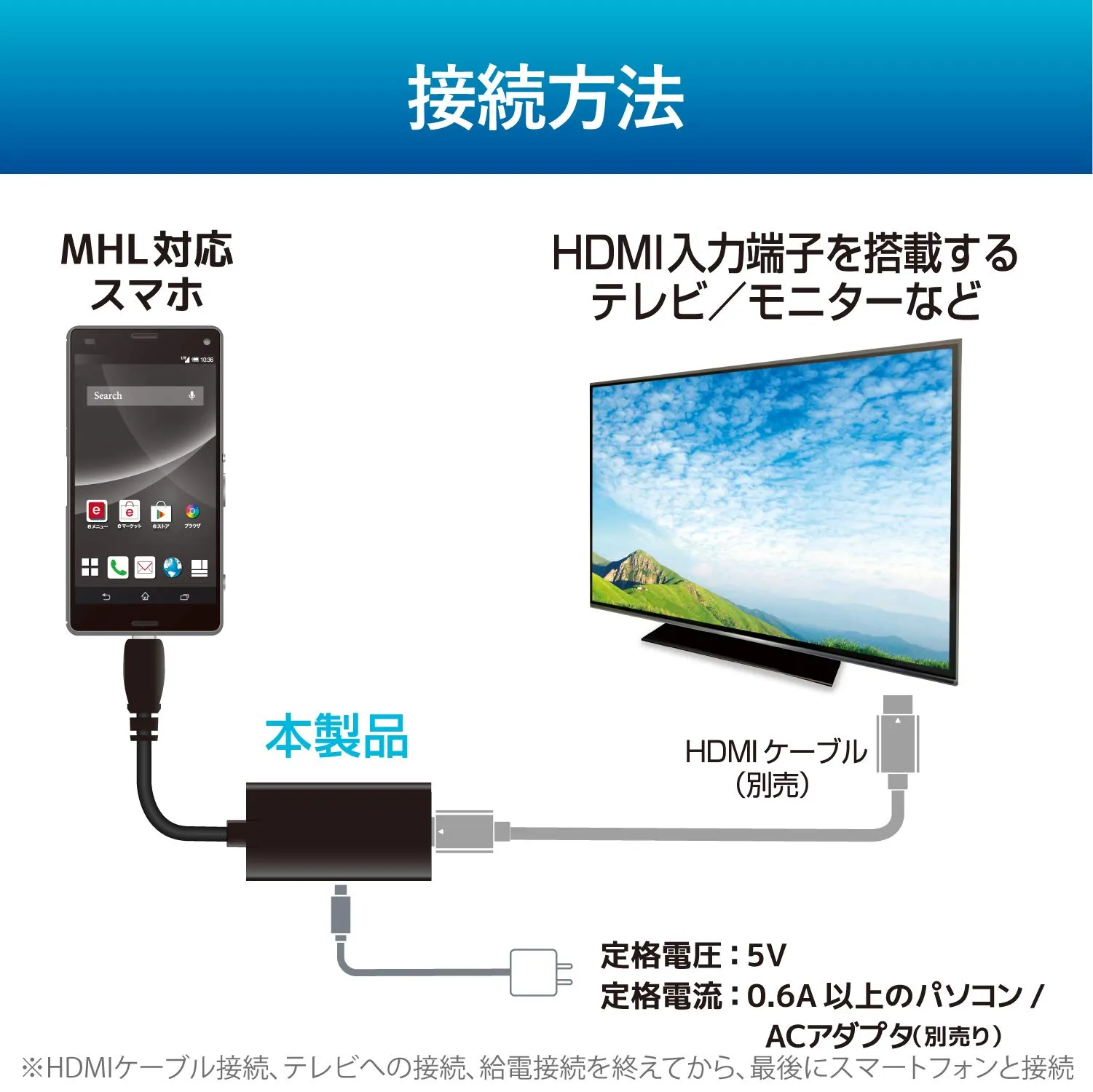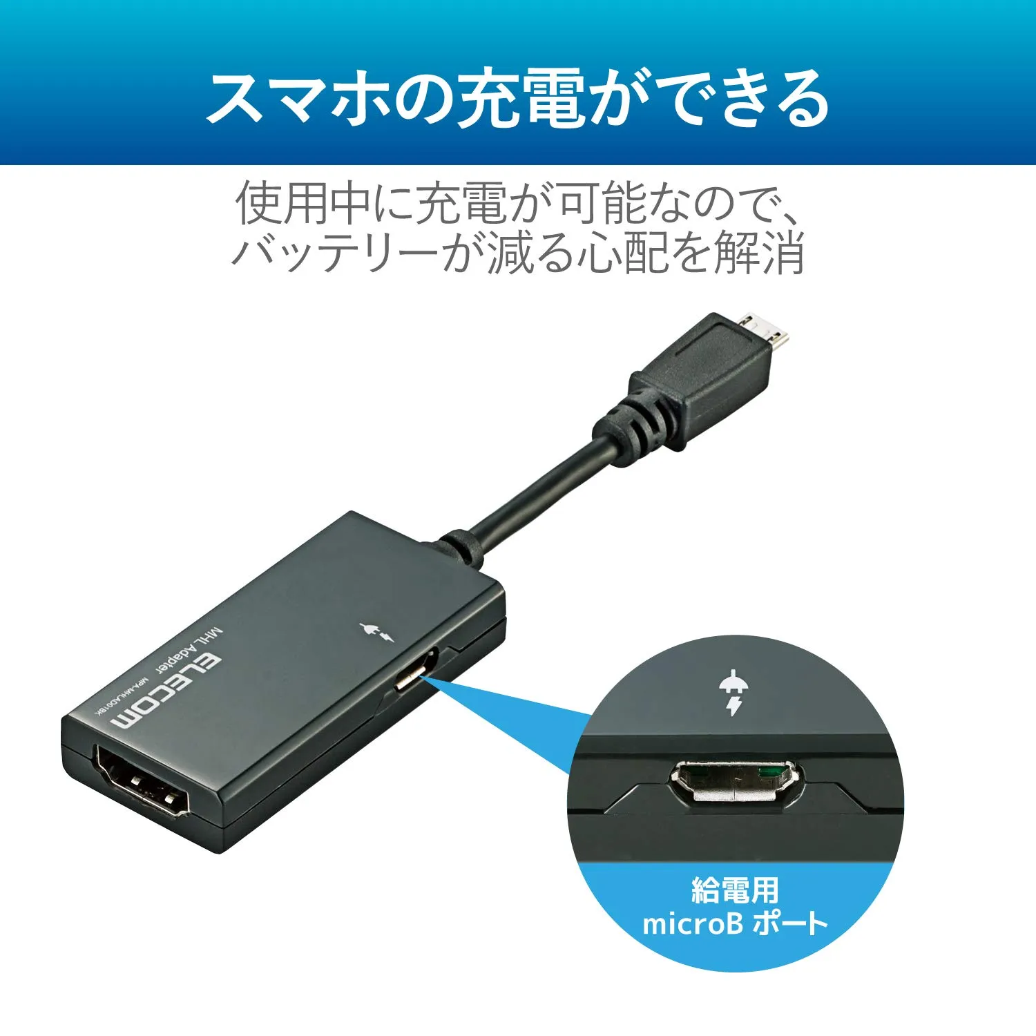 MHLに対応し、USB(microBタイプ)のインターフェースを持つスマートフォンに接続し、HDMI(TypeA)のインターフェースを持つテレビやモニタなどHDMIケーブルで接続し、映像と音声を楽しめるMHL変換アダプタです。スマートフォンの映像が、テレビなどの大画面で楽しめます。※HDMIケーブルは付属していません。※パソコンやACアダプタから、本製品への給電が必要です。最大1080pの映像に対応しています。※解像度は接続する機器の性能に依存します。