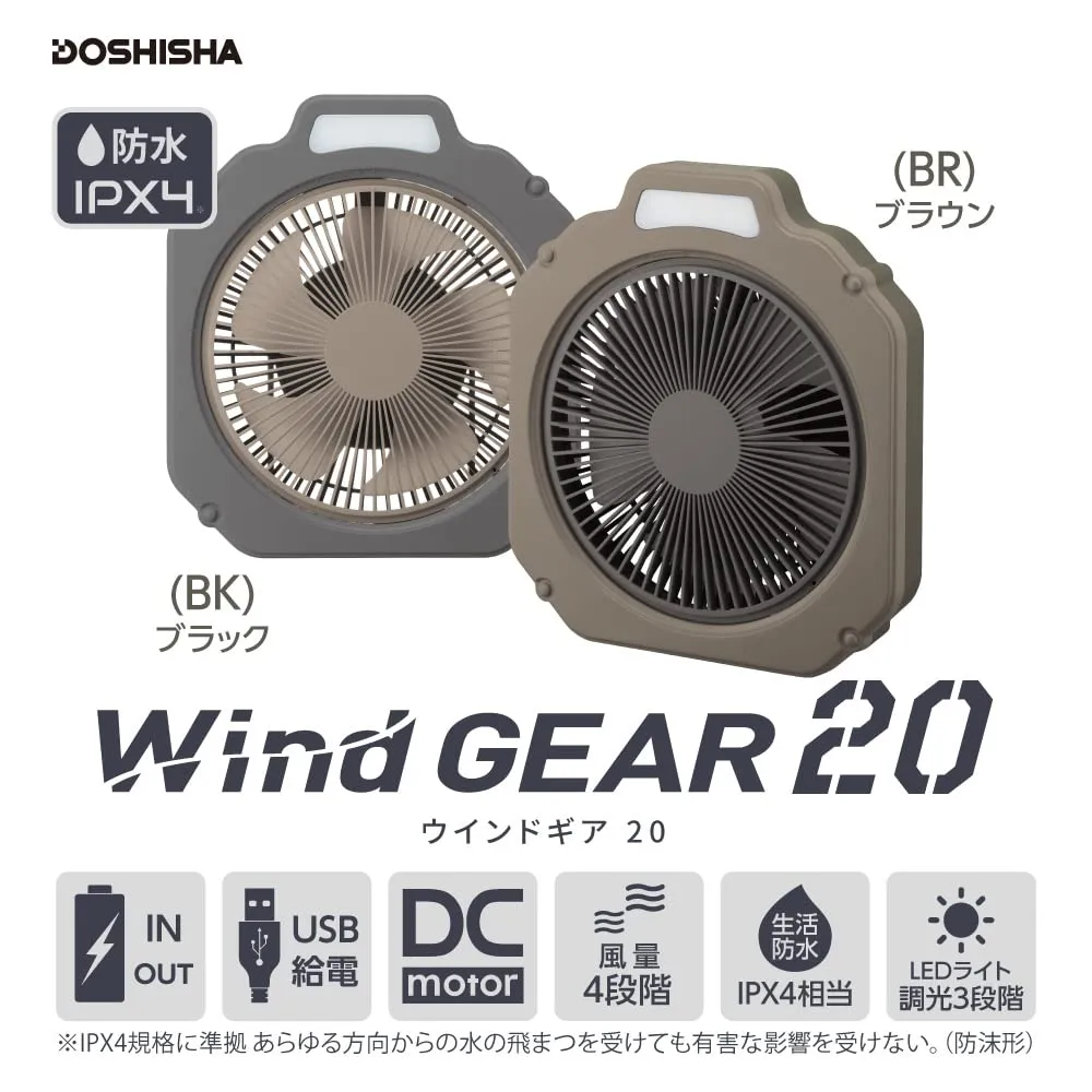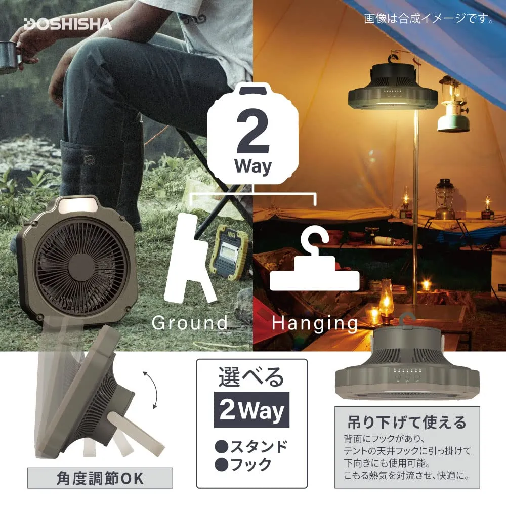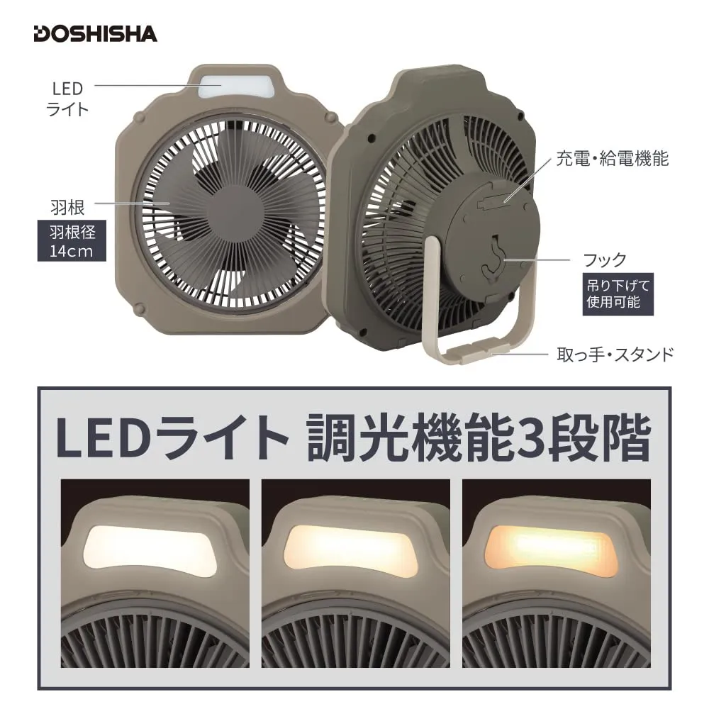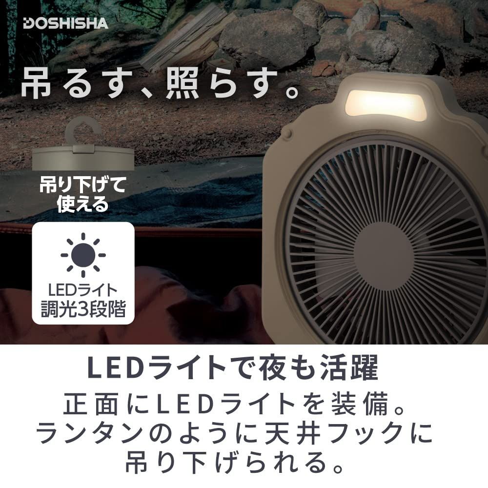 ファン+ライト、アウトドアに必須の機能を備えたライト付きファン。持ち運べて風量4段階、防水仕様のタフなボディ。スマホも充電できる給電機能も。テントやタープに吊り下げて送風、ランタンがわりにもなるライト付き。安心の防水仕様。水滴や小雨に耐えられる仕様。防水機能。IPX4規格に準拠。あらゆる方向からの水の飛まつを受けても有害な影響をうけない。正面にLEDライトを装備。ランタンのように天井にフックで吊り下げられる。背面にフックがあり、テントの天井に引っ掛けて下向きにも使用可能。こもる熱気を対流させ快適に。収納に便利な収納袋付き。LEDライト