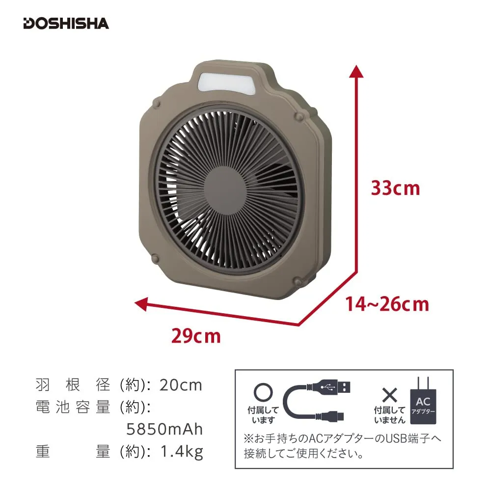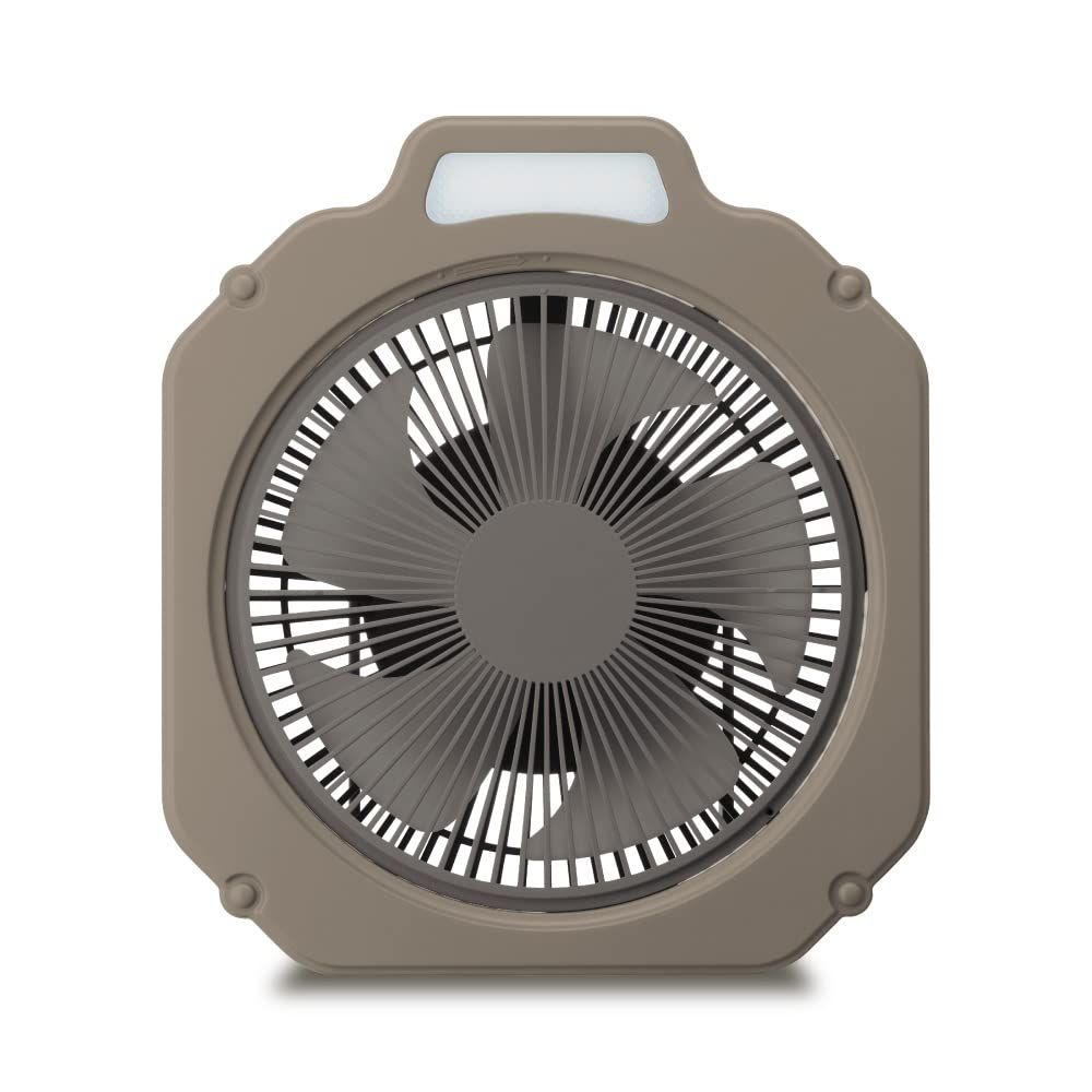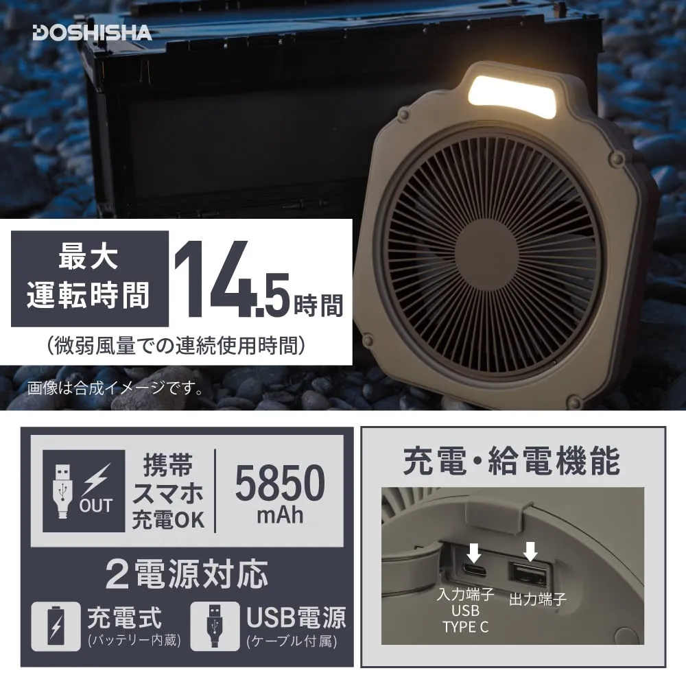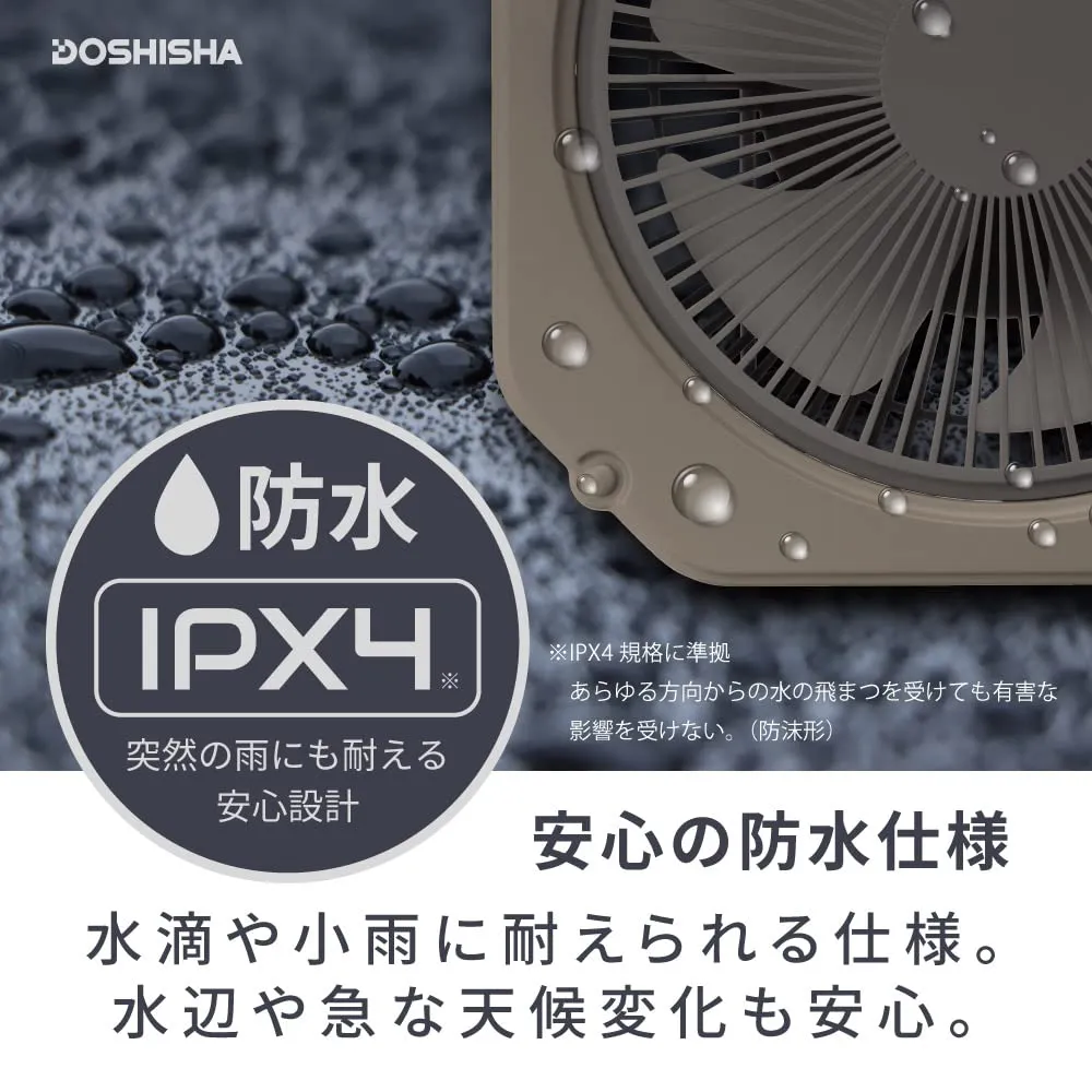 ファン+ライト、アウトドアに必須の機能を備えたライト付きファン。持ち運べて風量4段階、防水仕様のタフなボディ。スマホも充電できる給電機能も。テントやタープに吊り下げて送風、ランタンがわりにもなるライト付き。安心の防水仕様。水滴や小雨に耐えられる仕様。防水機能。IPX4規格に準拠。あらゆる方向からの水の飛まつを受けても有害な影響をうけない。正面にLEDライトを装備。ランタンのように天井にフックで吊り下げられる。背面にフックがあり、テントの天井に引っ掛けて下向きにも使用可能。こもる熱気を対流させ快適に。収納に便利な収納袋付き。LEDライト