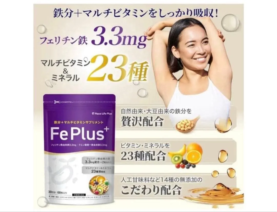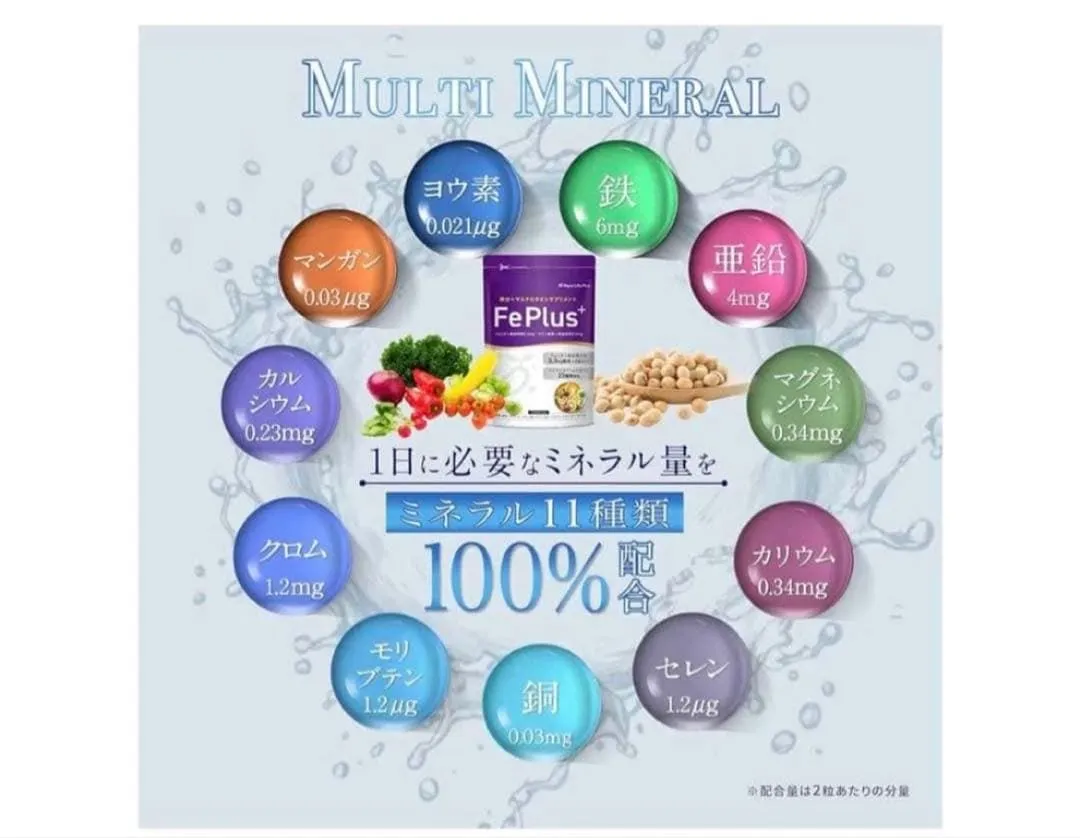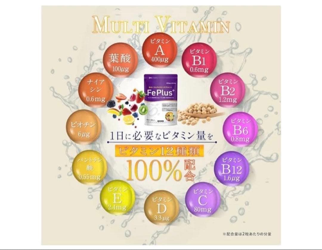 【大豆由来のフェリチン鉄3.3mg+マルチビタミン&ミネラル23種贅沢配合】大豆由来のフェリチン鉄3.3mgに加えて、マルチビタミン&ミネラル23種配合しており、業界屈指の配合量です。
