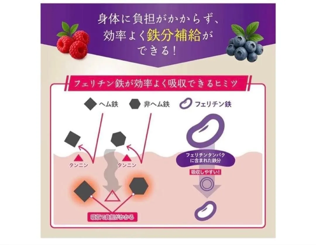 【フェリチン鉄とは】フェリチン鉄は身体への負担が少なく、効率よく鉄分補給ができる成分です。フェリチンタンパクに鉄分が包まれることにより、吸収をサポートしてくれます。