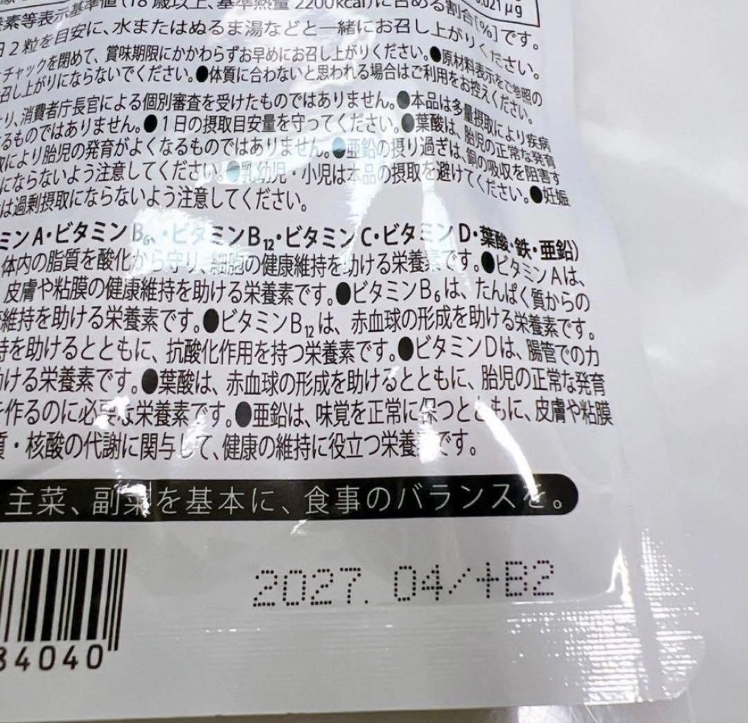 【原材料名】還元麦芽糖水飴(国内製造)、デキストリン、大豆抽出物、酵母(亜鉛含有、ビオチン含有、セレン含有、銅含有、モリブテン含有、クロム含有、マンガン含有、ヨウ素含有、)、V.E含有植物油、乳酸菌混合末/V.C、セルロース、クエン酸第一鉄ナトリウム、微粒二酸化ケイ素、ステアリン酸Ca、V.B₆、V.A、V.B₁、V.B₂、パントテン酸Ca、ナイアシン、酸化Mg、塩化K、貝Ca、葉酸、V.D、V.B₁₂、(一部に乳成分・大豆を含む)