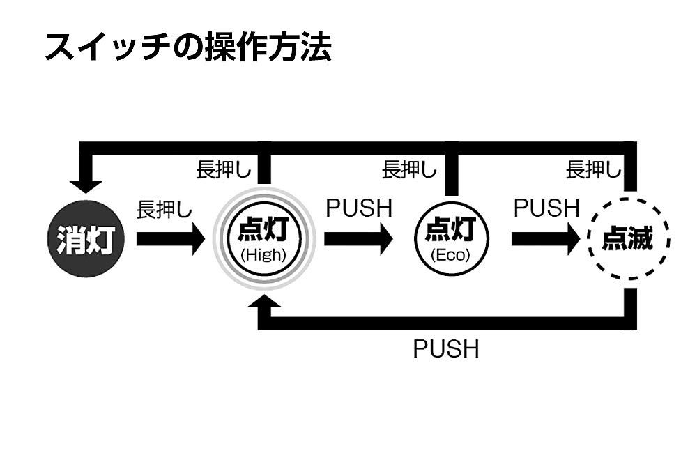 22cm明るさ:High/210ルーメン、Eco/20ルーメン使用電池:専用充電池使用光源:高輝度チップタイプ白色LED×1灯実用点灯(約):High/2.5時間、Eco/10時間、点滅/16時間機能:1m落下耐久、防滴仕様(IPX4準拠)最大照射距離:約109m
