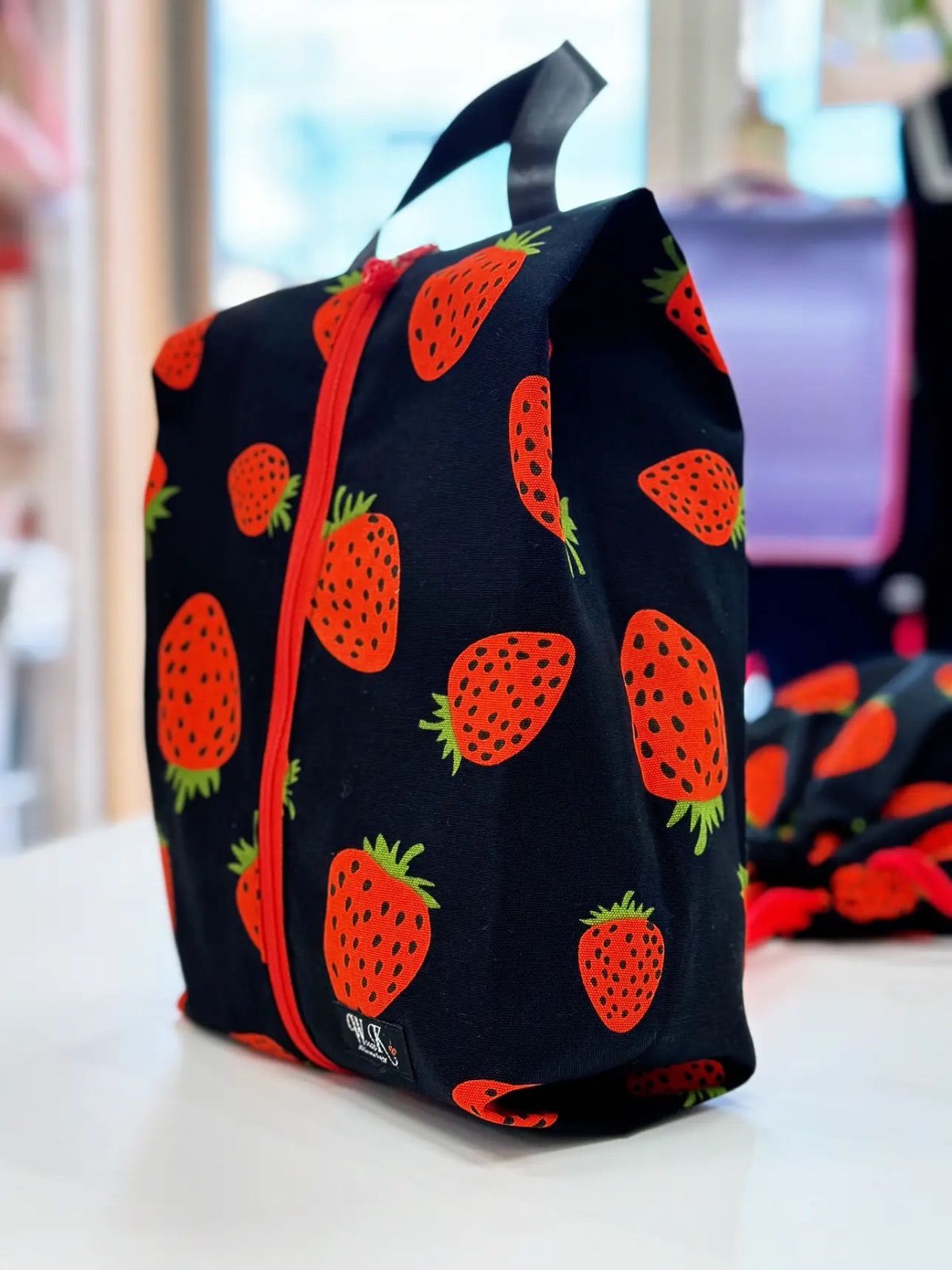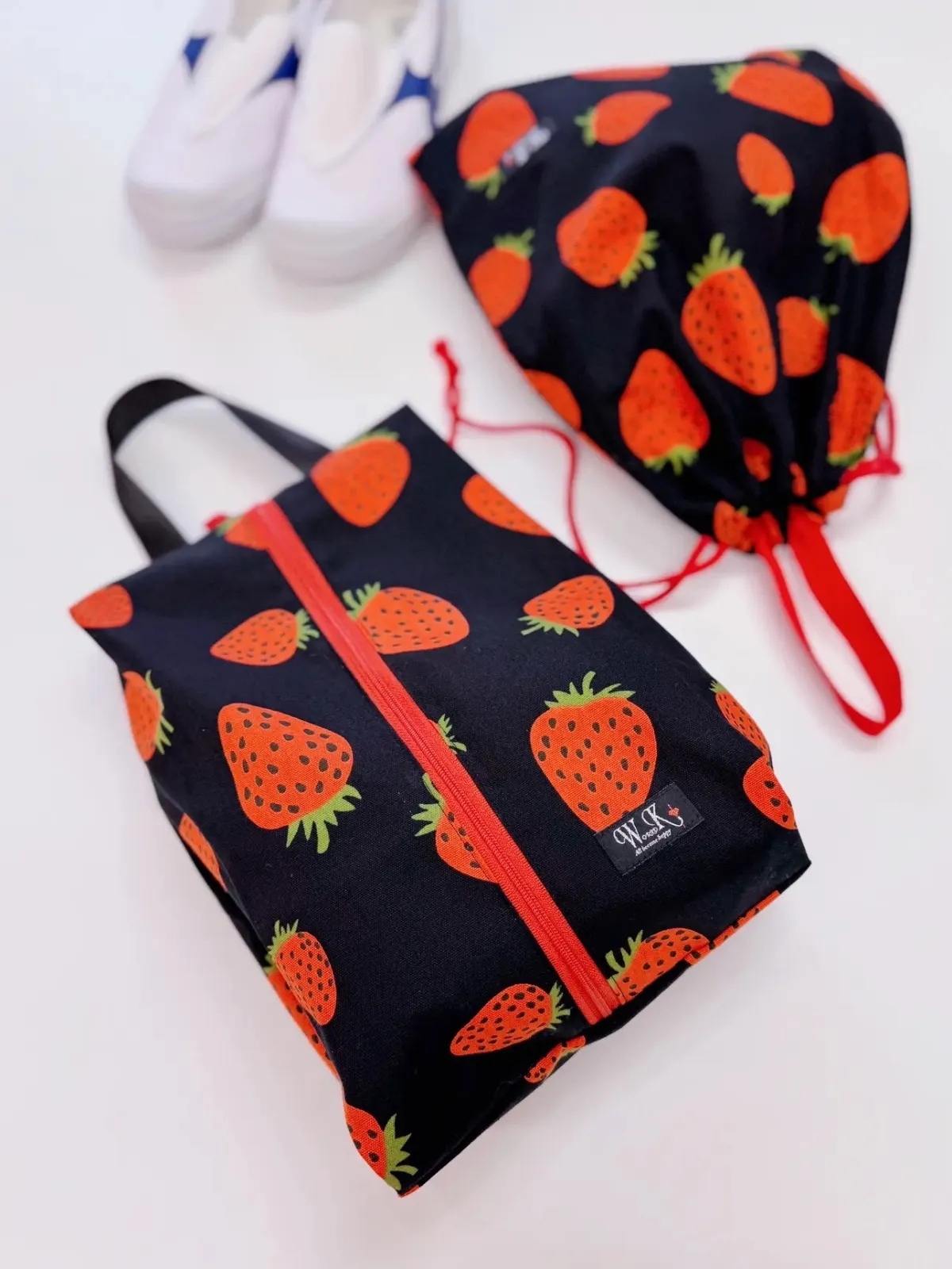 サイズ25.0㎝まで対応、様々な靴をしっかり収納できます♪ - デザイン: いちご柄 - 色: ブラック×レッド - 素材: 綿100% このファスナーシューズ入れは、開け閉めがスムーズなファスナー付き。収納力抜群で、旅行やジム、日常使いにも最適です! 便利なサイズ感で、靴以外の小物も収納可能! レジャーやオフィスにもぴったりです(^_−)−☆ 送料無料です♪ 店舗販売もしているため、売り切れの場合もあります。ご了承ください。