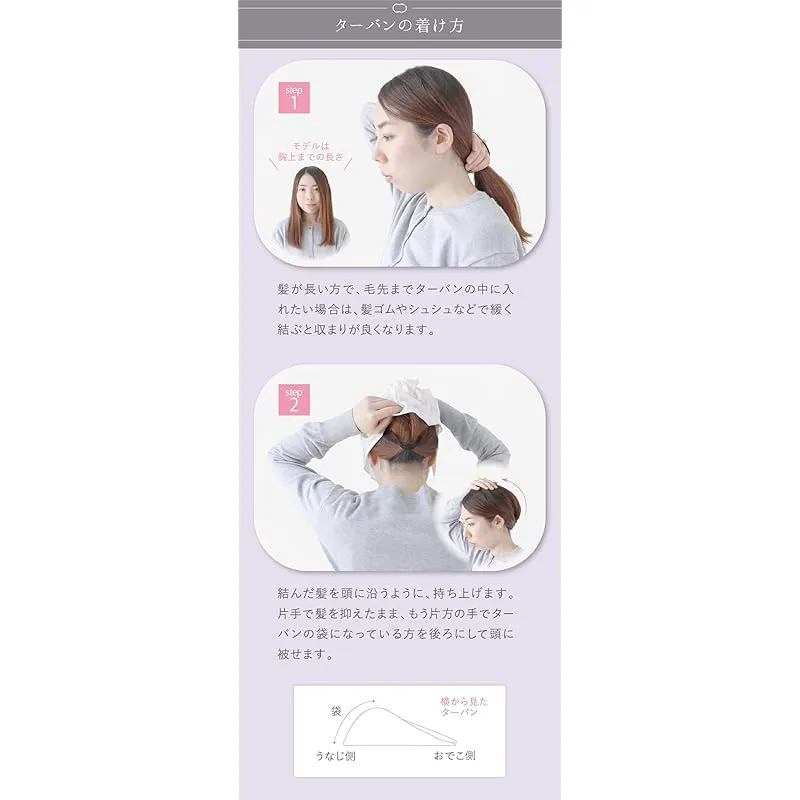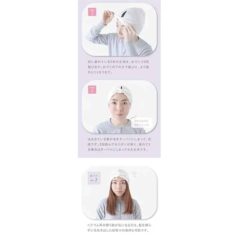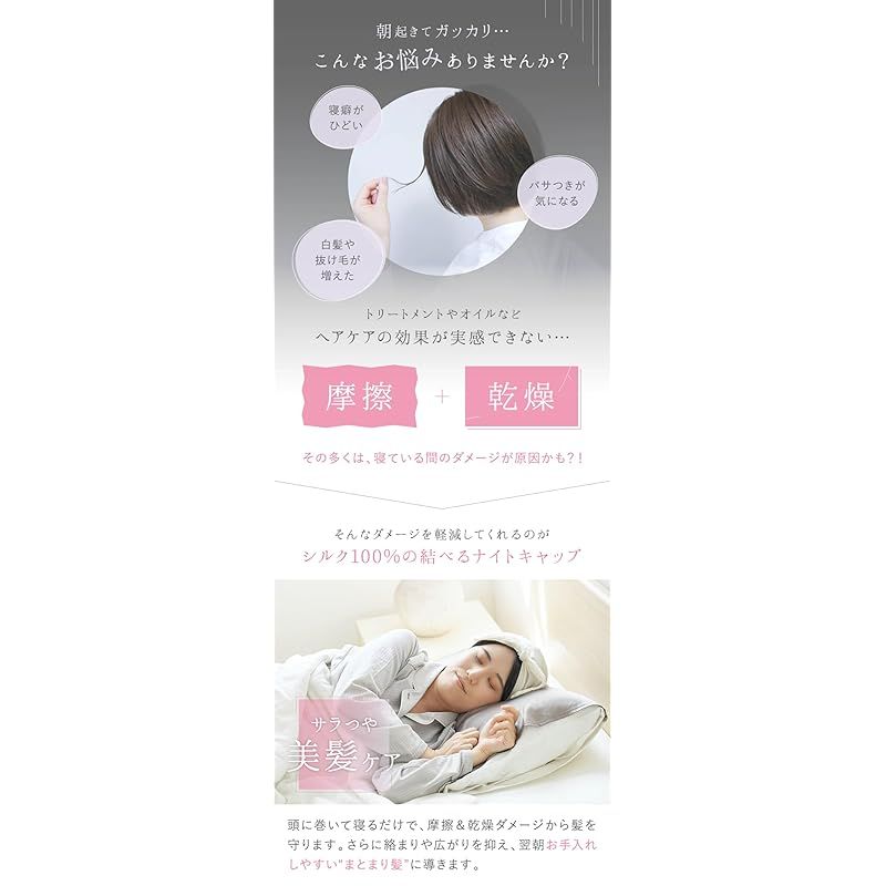 【ナイトキャップと効果は同じ長時間着けても快適なシルク100%ターバン】朝起きた時の髪のパサつきや広がり、気になっていませんか? シルクのターバンは枕との摩擦を軽減し寝癖を抑えつつ シルクの保湿成分で乾燥を防ぎます。 ナイトキャップにありがちな「朝起きたら脱げていた」 「ゴムがキツくて頭が痛くなってしまう」 などの悩みを解決してくれるシルクのターバンで美しい髪を手に入れましょう!