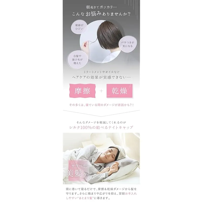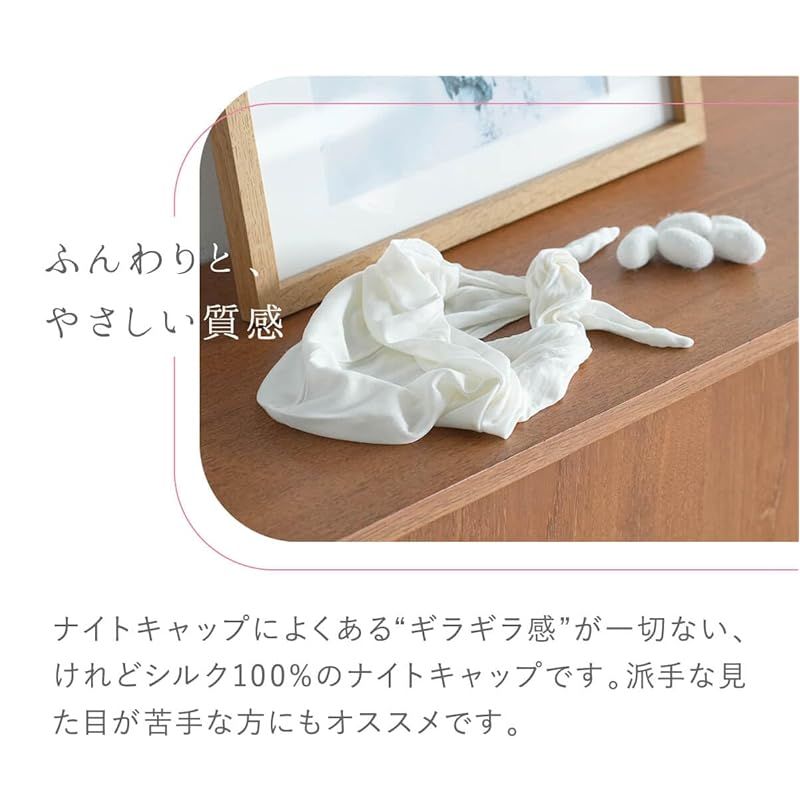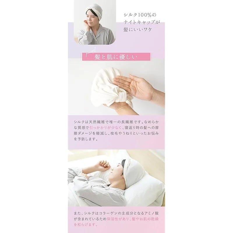 着用して寝るだけで、摩擦による髪の乱れや乾燥を防いで、まとまりをよくします。シルクは吸放湿性に優れているので、汗をかいても蒸れずに快適な着け心地です。