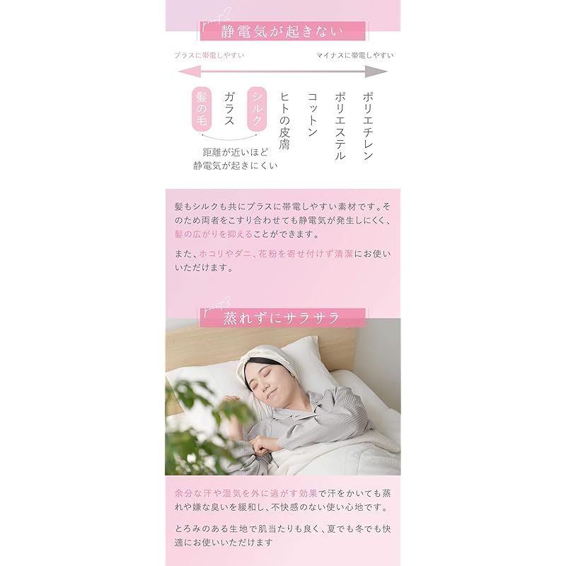 【シルクの嬉しい効果】1. 人の肌と同じたんぱく質でできているから、髪や肌に優しく馴染む。 2.保湿性が高く、髪や肌に潤いを与えて感想を防ぐ。 3.吸放湿性に優れているので、一年中快適に使える。