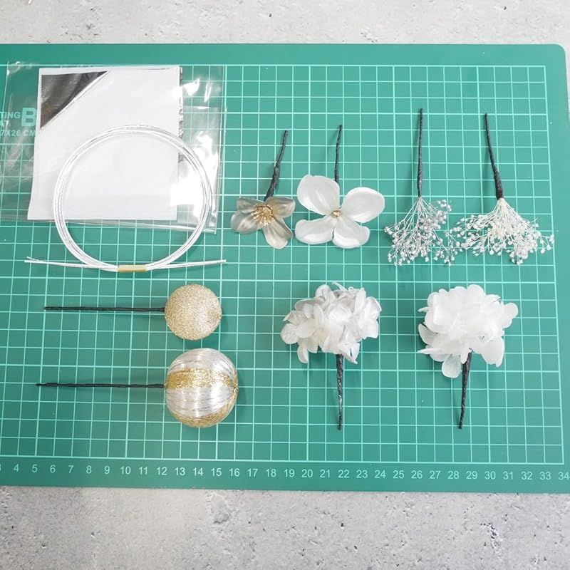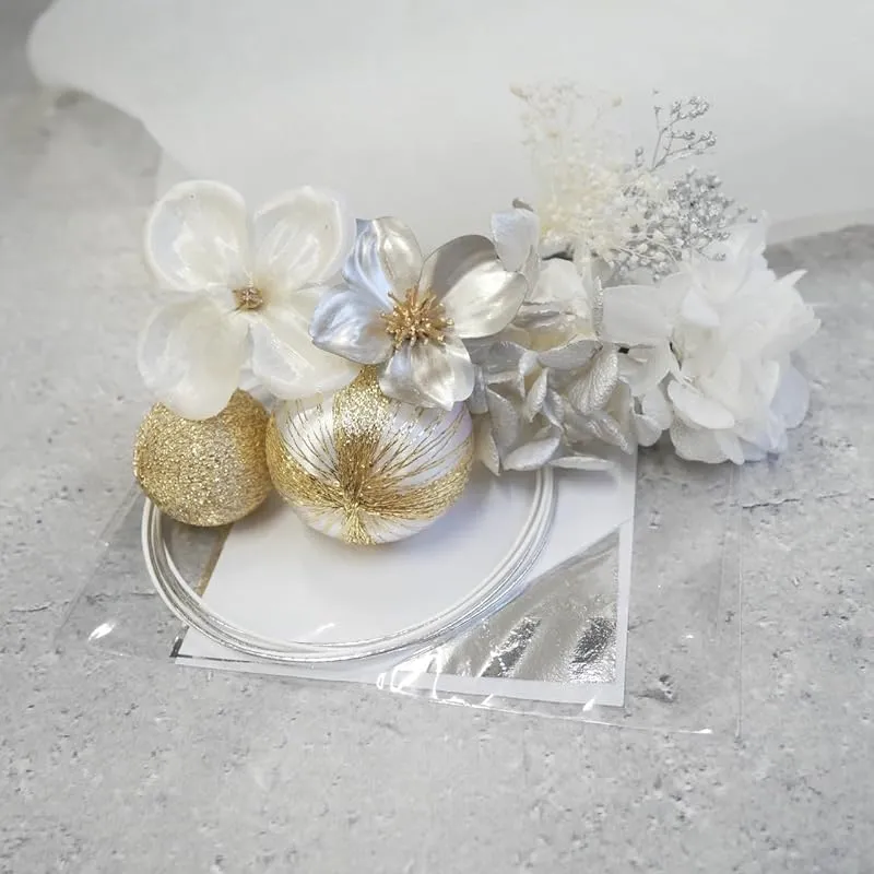 ??パーツ詳細??ドライフラワー 4パーツ、アートフラワー 1パーツ、水引 約90cm(シルバー1本、白1本)、和玉 白ゴールド 大、ブロンズ 小、ハードシルバー 小、シルバー箔