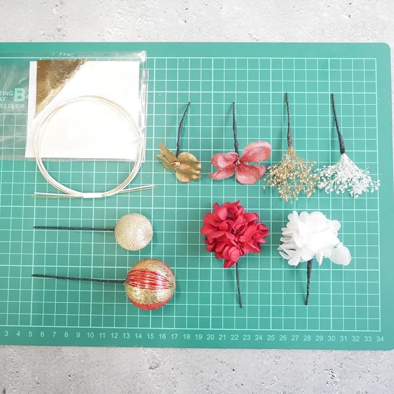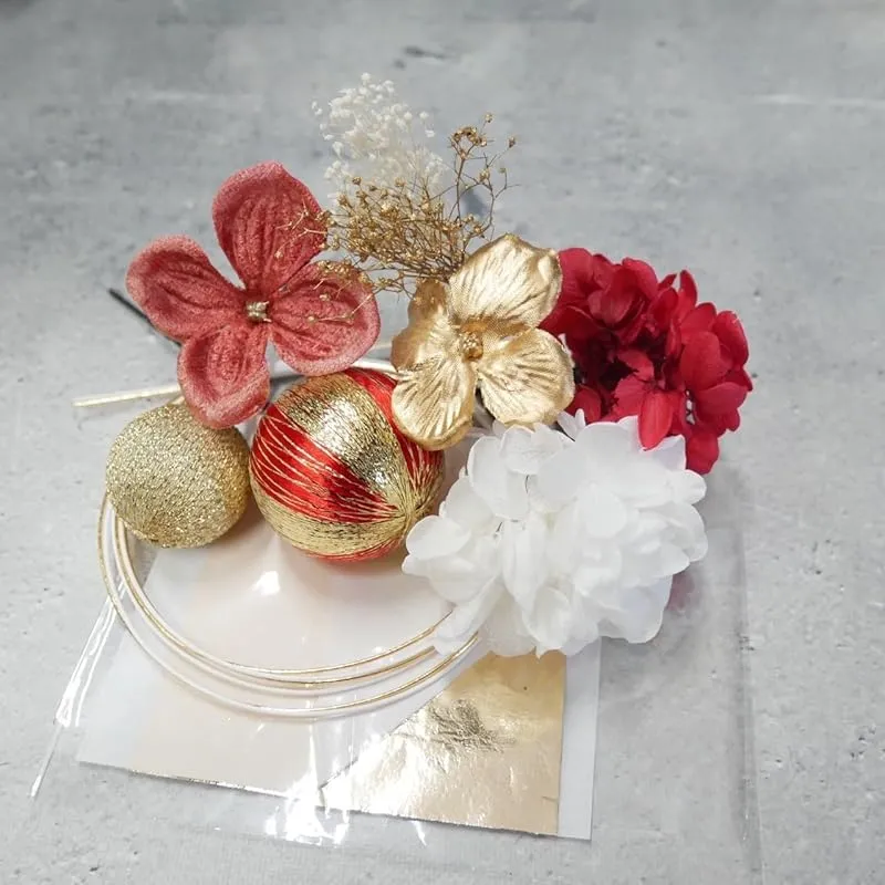 ??パーツ詳細??ドライフラワー 4パーツ、アートフラワー 2パーツ、水引 約90cm(ブロンズ1本、白1本)、和玉 赤ゴールド 大、ブロンズ 小、ブロンズ箔
