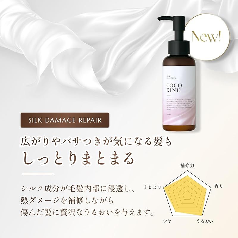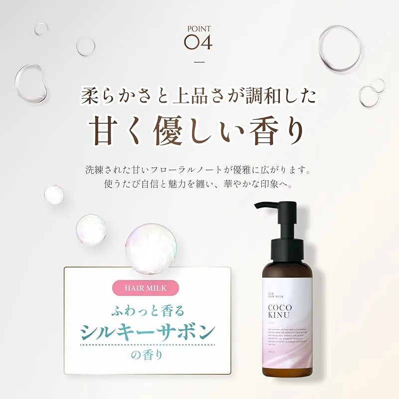 あのCOCO KINUシリーズにヘアミルクが登場! シルクにこだわった成分が毛髪1本1本を集中ケア。 うねりを解消し、指通りを改善します。さらに、シルクのような艶やかさをコンセプトとし、 使い続けていただくことで、輝きを増すうるツヤ髪へ
