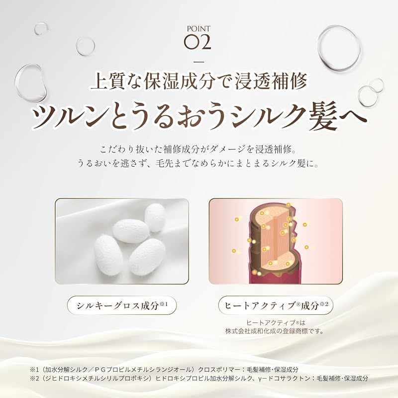 【広がりやパサつきが気になる髪もしっとりまとまる】シルク成分が毛髪内部に浸透し、熱ダメージを補修しながら傷んだ髪に贅沢なうるおいを与えます。