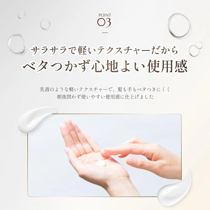 【ベタつかず心地よい使用感】乳液のような軽いテクスチャーで、髪も手もベタつきにくく朝夜問わず使いやすい使用感に仕上げました。