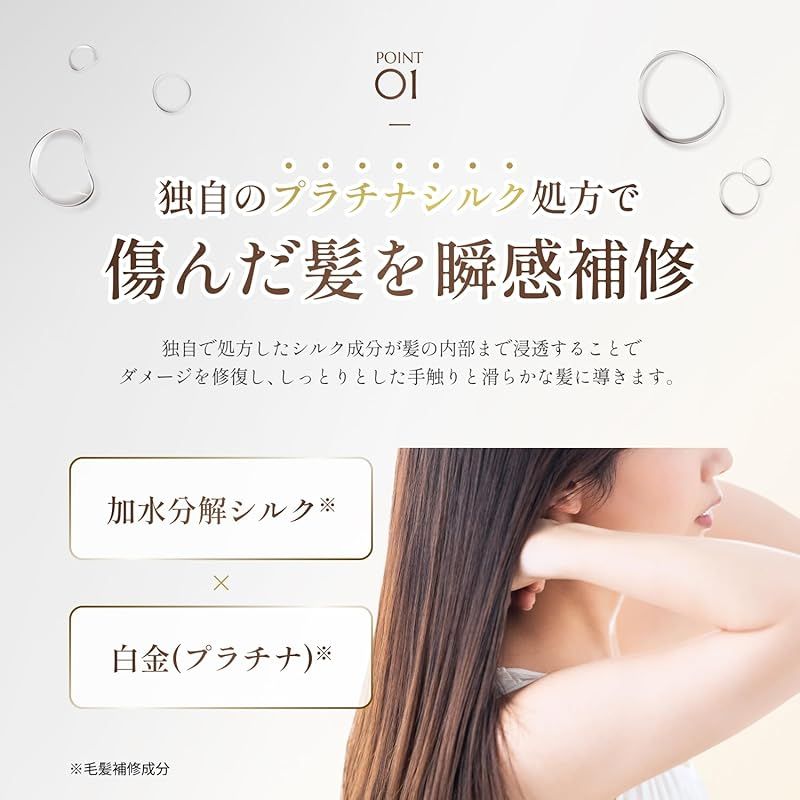 【独自のプラチナシルク処方】独自で処方したシルク成分が髪の内部まで浸透することでダメージを補修し、美容室帰りのようなしっとりとした手触りと滑らかな髪に導きます。