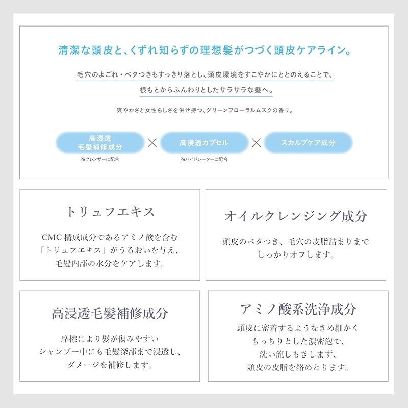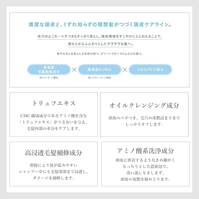 CMC構成成分であるアミノ酸を含む「トリュフエキス」がうるおいを与え、毛髪内部の水分をケアします。