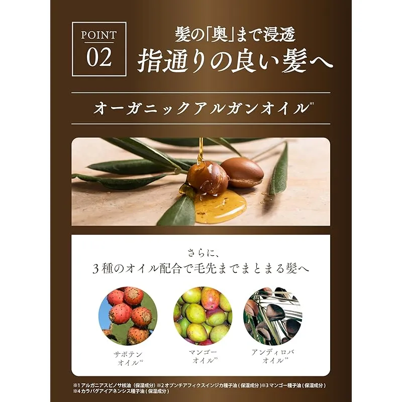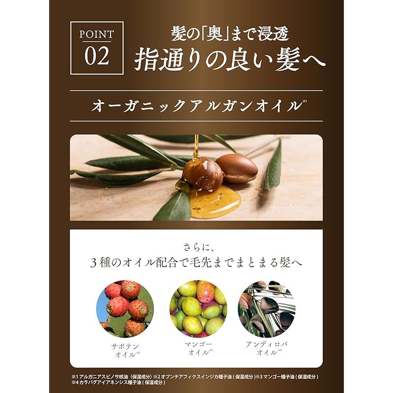 ●オーガニックアルガンオイル(※1)、オーガニックサポテオイル(※3)、オーガニックサボテンオイル(※4)、オーガニックマンゴーオイル(※5)、オーガニックアンディロバオイル(※6)配合 ※1 アルガニアスピノサ核油(保湿成分) ※2 ステアルジモニウムヒドロキシプロピル加水分解ケラチン・ケラチン(羊毛)・イソステアロイル加水分解ケラチン(羊毛)(補修成分) ※3 ポウテリアサポタ種子油(保湿成分) ※4 オプンチアフィクスインジカ種子油(保湿成分) ※5 マンゴー種子油(保湿成分) ※6 カラパグアイアネンシス種子油(保湿成分) ※パッケージデザイン等は予告なく変更されることがあります