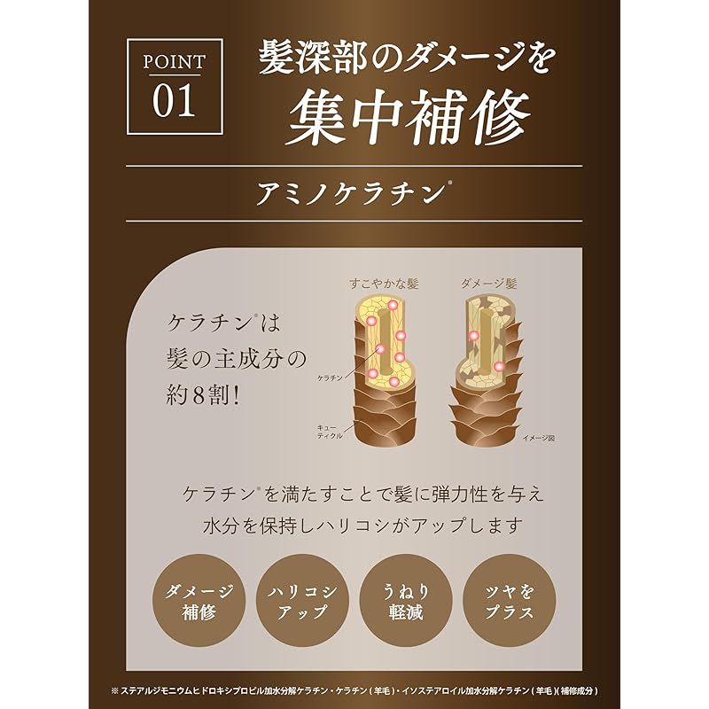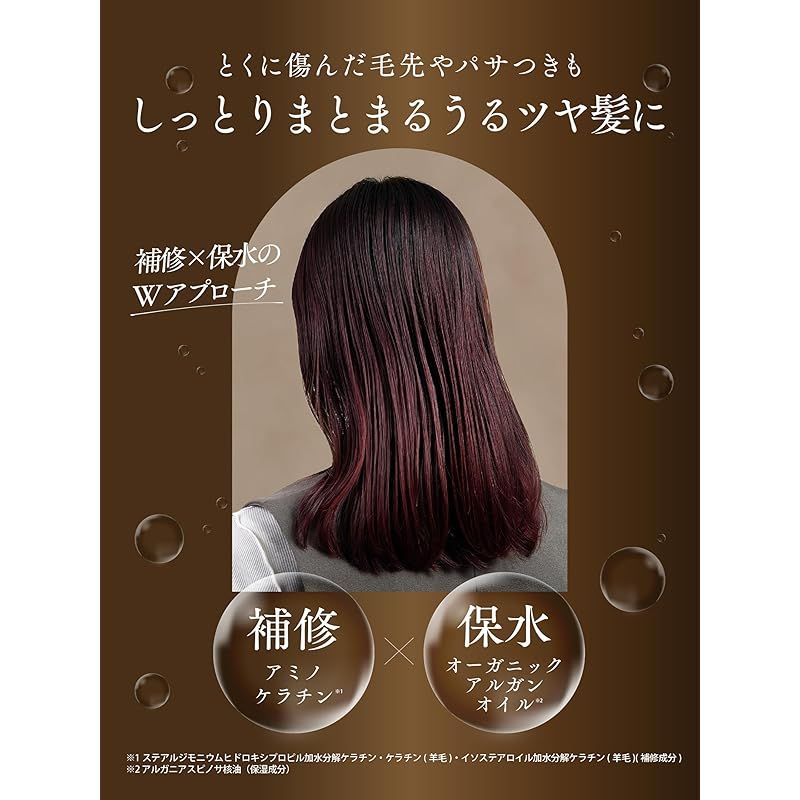 オーガニックアルガンオイル(※1)と独自のビューティーケラチン処方でダメージを補修。「アミノケラチン(※2)」が特に傷んだ毛先やパサつきも集中ダメージ補修し、しっとりまとまる髪へ導きます。