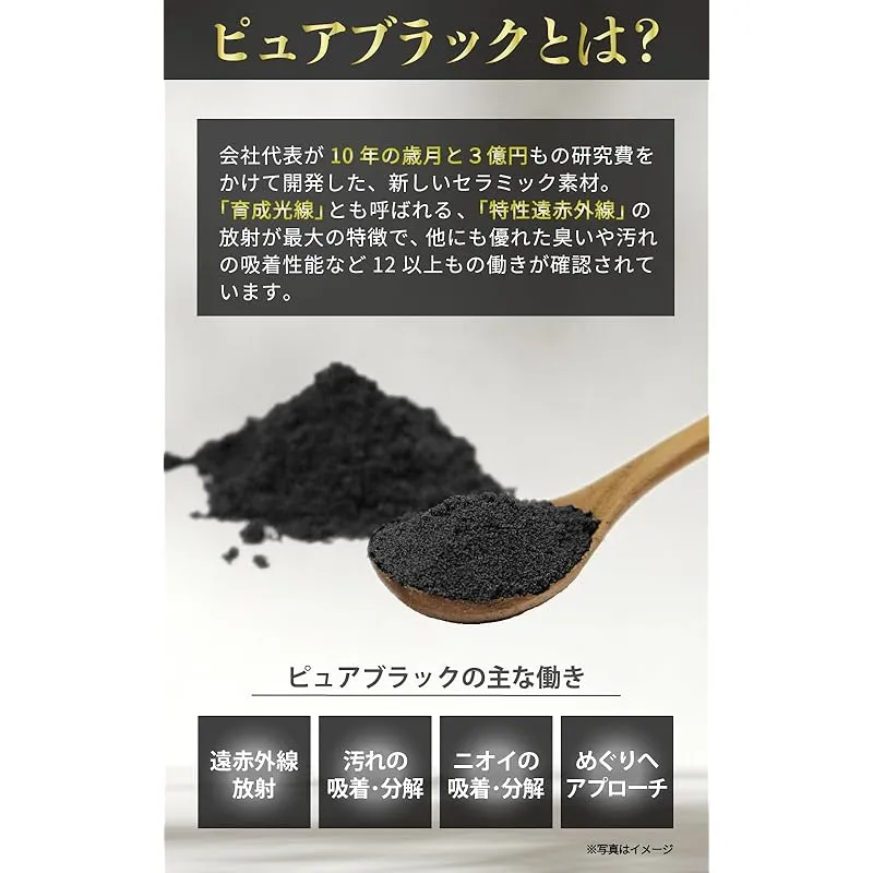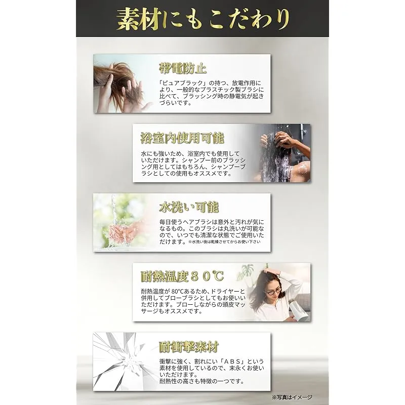 会社代表が10年の歳月と3億円もの研究費をかけて開発した、新セラミック素材「ピュアブラック」を配合したヘアブラシです。ほつれた髪もするするとほぐすことができ、ピュアブラックが発する「特性遠赤外線」の働きが頭皮のめぐりに働きかけ、その優れた吸着作用により。髪についた嫌なニオイや、頭皮の不要な皮脂や汚れまでケアします。 またピュアブラックには放電作用もあるため、一般的なナイロン製のヘアブラシに比べ、静電気の発生も軽減してくれます。