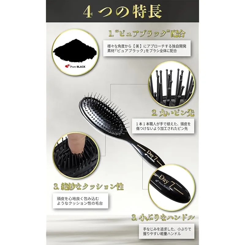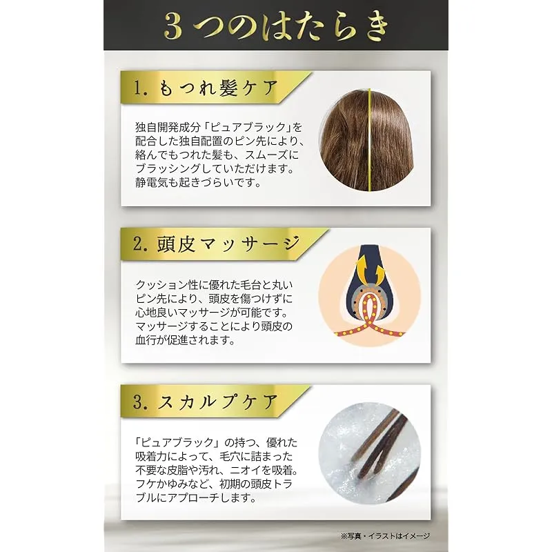 【3つのはたらき】―[もつれ髪ケア]ピュアブラックの持つ共振作用により、もつれた髪をときほぐします。[頭皮マッサージ]適度なクッション性を持つ毛台と丸みを帯びたピン先により、頭皮を優しくマッサージでき、健康的な髪の生える環境へと導きます。[スカルプケア]ピュアブラックの持つ吸着性により、頭皮に詰まった余分な汚れやニオイを取り除きます。