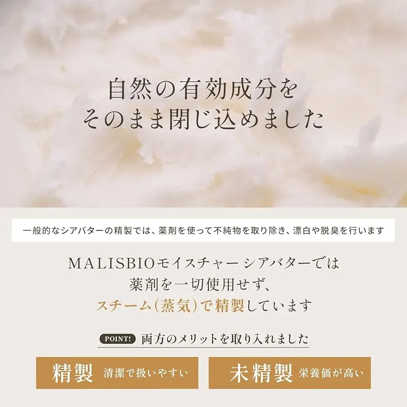 【精製と未精製の良いとこ取り】マリスビオのオーガニック100%シアバターの精製は天然原料およびスチームで行います。シアバター本来の成分がそのまま残っています。もちろんファーストプレスでソルベントフリーですが、シアの収穫も一番収穫なので上級グレードとなります。