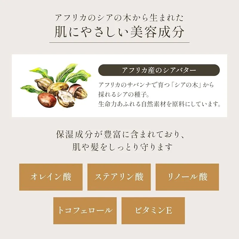 [商品説明] シアバターとは、アフリカでシアナッツと呼ばれるシアの木の実から採れる天然の植物油脂です。アフリカでは1000年以上前から厳しい乾燥からお肌を守るために、天然の保湿クリームとして使用されてきました。産地アフリカでは乾燥ケアのために生まれたばかりの赤ちゃんにも塗られる習慣があります。シアの実からシアバターを製造する過程は重労働ですが、女性たちが手作業で感触を確かめながらシアバターを仕上げていきます。