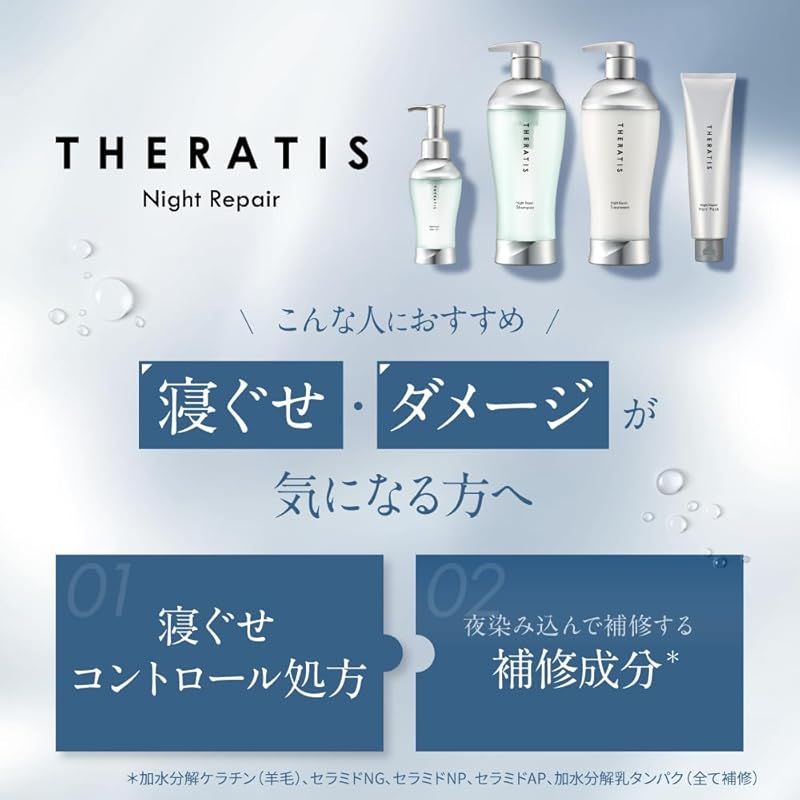 【コラーゲン1兆個(*1)最高峰(*2)ナイトケア】私が変わる、うるツヤ美髪整形(*4) *1製品に配合しているリポソーム成分(*4)の数量 *2当社既存品内(THERATISシリーズ内) *3髪の質感(しっとり感、つややかさ)を整える *4加水分解コンキオリンタンパク、加水分解コラーゲン、加水分解ダイズエキス(全て保湿)をリポソーム化したもの