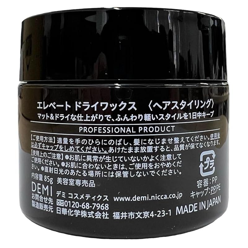 【商品詳細】 ブランド:デミコスメティクス 商品種別:ヘアワックス・ポマード 商品名:デミ エレベート ドライワックス 8F 85g 製造元:日華化学株式会社 商品番号:27023 発売日:2023年08月31日 商品内容:85g 色:クリア