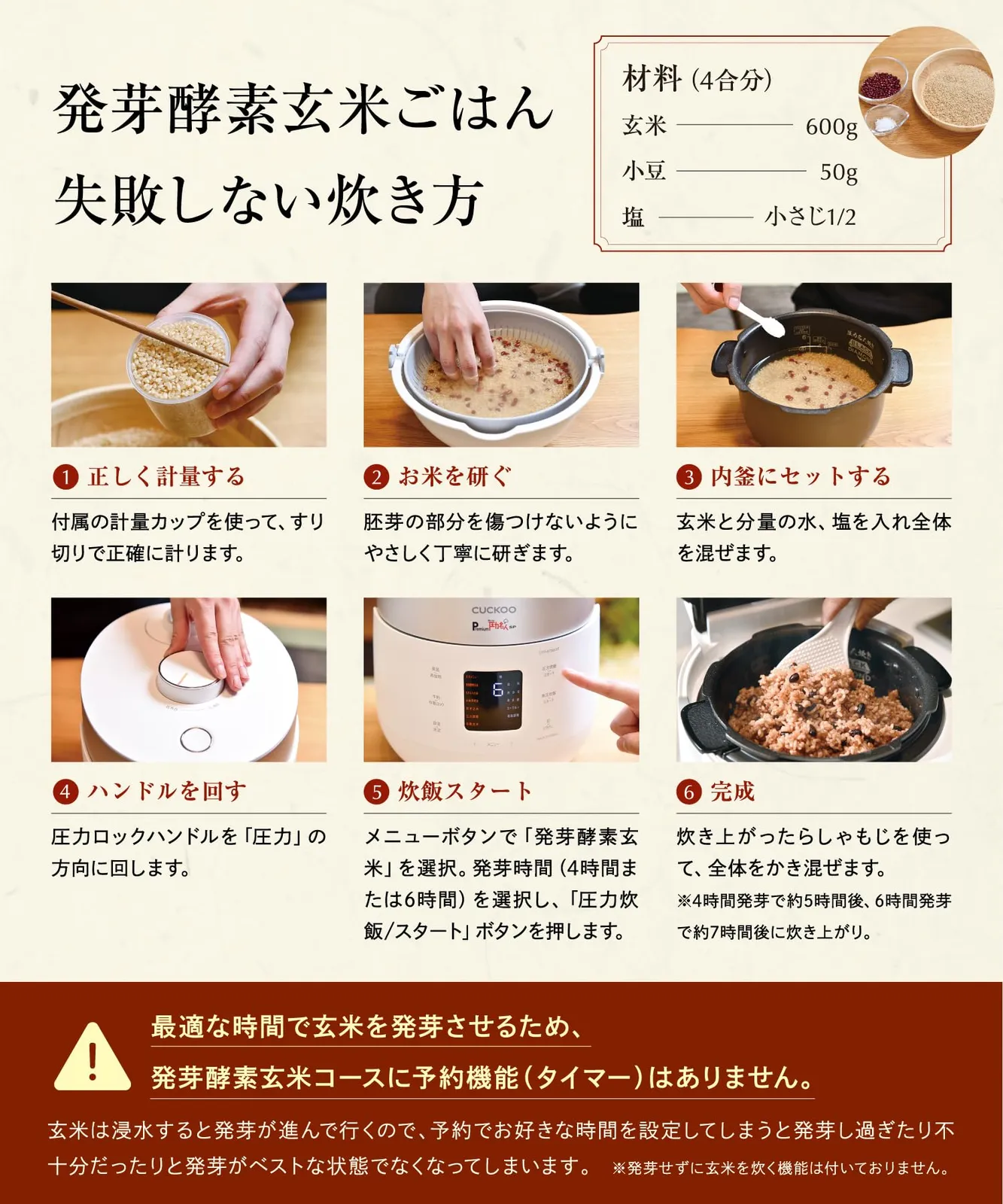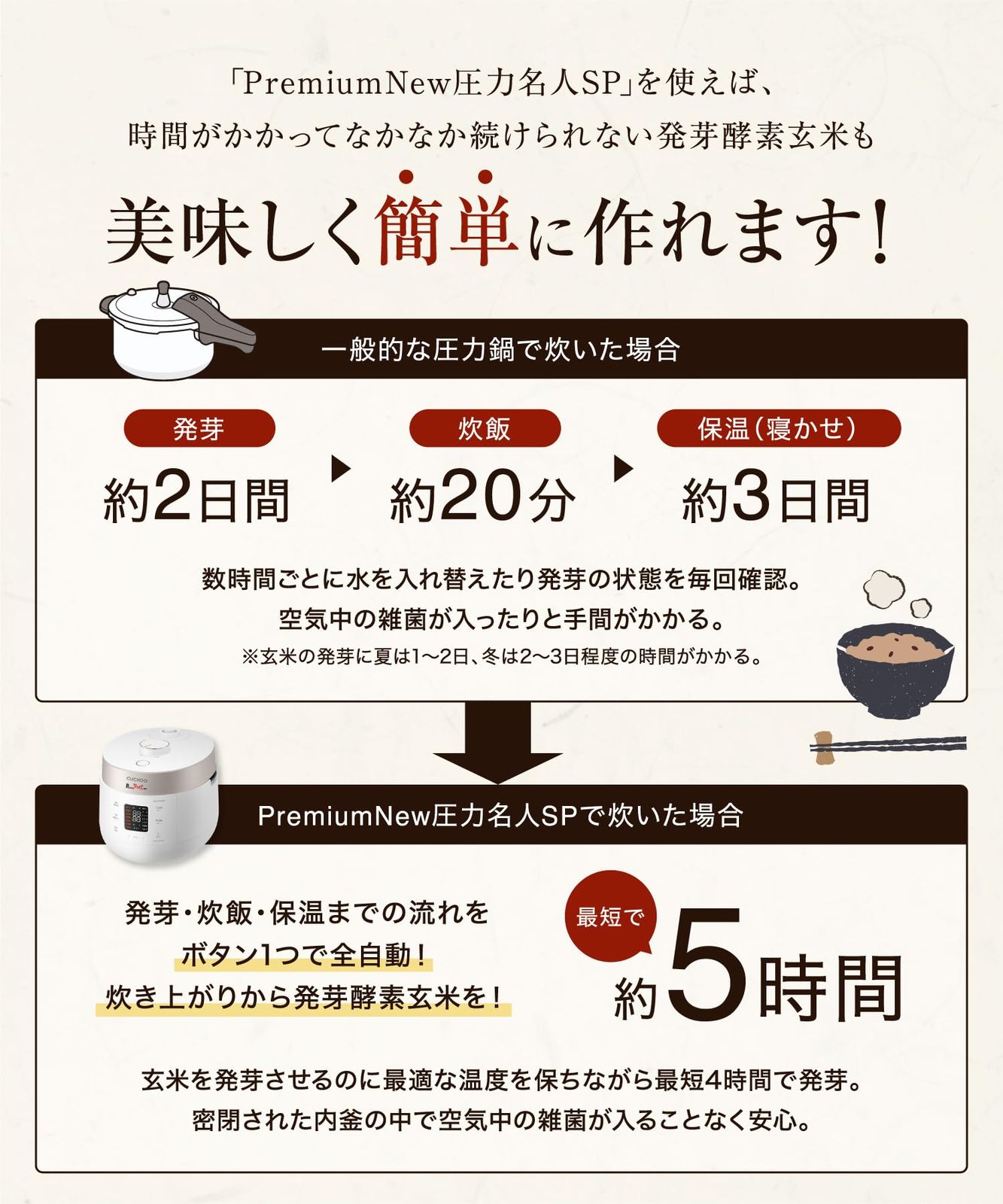 圧力鍋で玄米を炊いても美味しくならない。自分で発芽させるのは面倒。正確に発芽時間・温度を調整することは難しい・・・PremiumNew圧力名人SPはそんなあなたのお悩みを解決します。ボタン1つで「発芽」「炊飯」「保温」が全自動。忙しい毎日でもご自宅で簡単に発芽酵素玄米ごはんが食べられます。