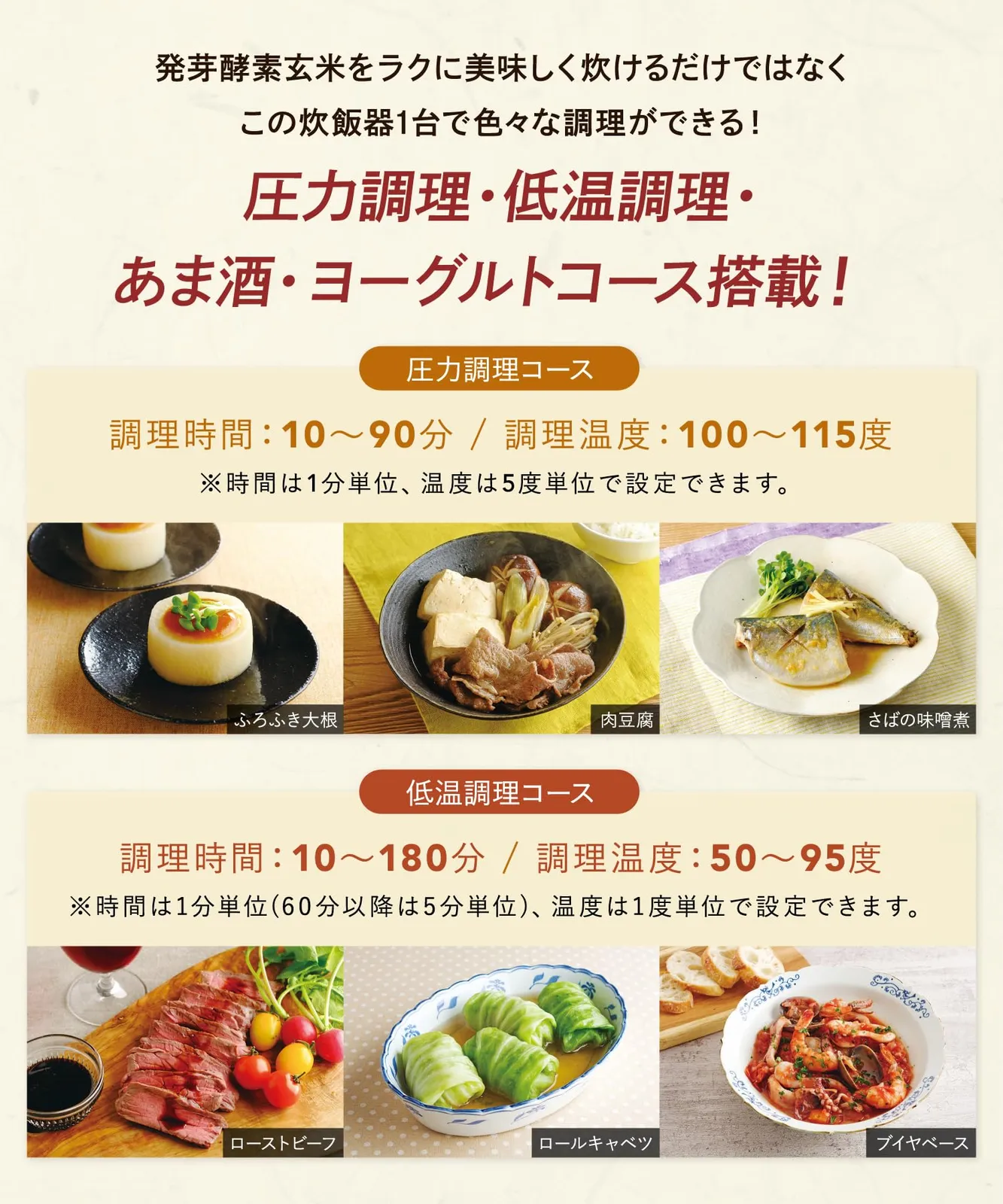 【これ1台で多彩な料理ができる】圧力調理と低温調理コースでローストビーフや肉じゃがなど簡単に作ることができます。また腸内環境を整えるあま酒やヨーグルトコースもある多機能炊飯器です。