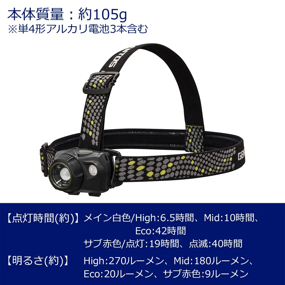 (単4形アルカリ電池×3本)明るさ:High/270ルーメン・Mid/180ルーメン・Eco/20ルーメン・サブ赤色LED/9ルーメン、使用電池:単4形アルカリ電池×3本または専用充電池