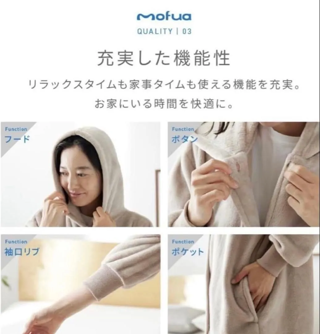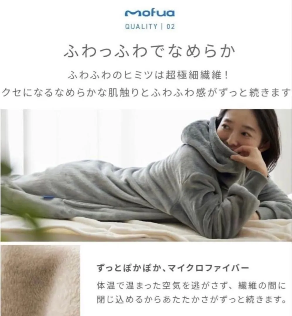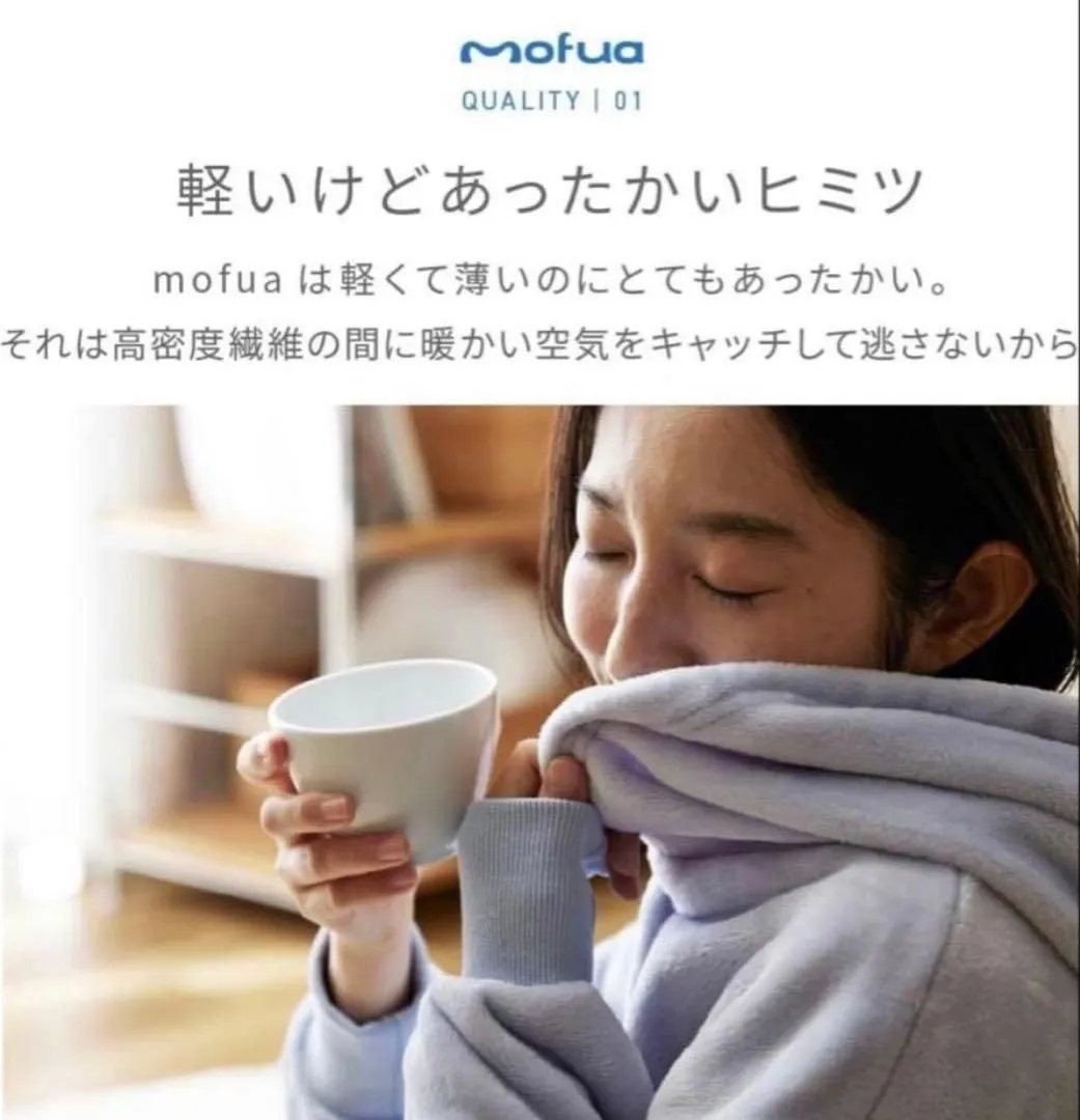 【あったかモフモフ着る毛布の心地よさでほっこり快適】シルクより細い超極細繊維を高密度に仕上げることで、ずっとすりすりしていたくなるほど「しっとりなめらかな肌触り」と「あったかさ」を兼ね備えた着る毛布です。たくさんの空気をためこめるので、あったかさもしっかり。暖房をつけなくても過ごせる日が増えて、光熱費の節約にも繋がります。もう「mofuaの着る毛布」が手放せなくなること請け合いです。