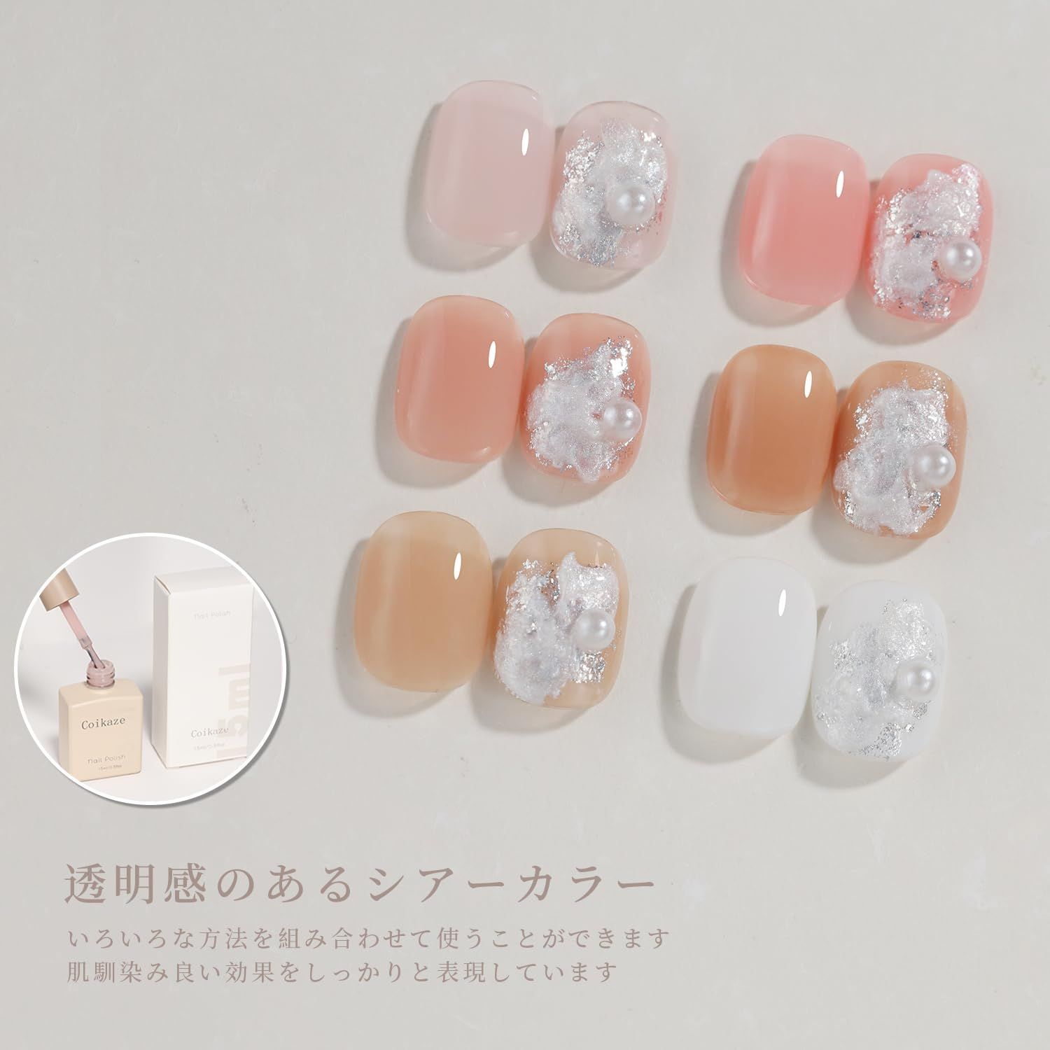 【キレイな発色】透け感あるシアーカラーため、グラデーションにも簡単です。どの季節でも使いしやすい上品カラーネイルジェルです。一度塗りでやわらかく発色、二度塗り・三度塗りでしっかり発色。気分に合わせて、お好みに組み合わせます。