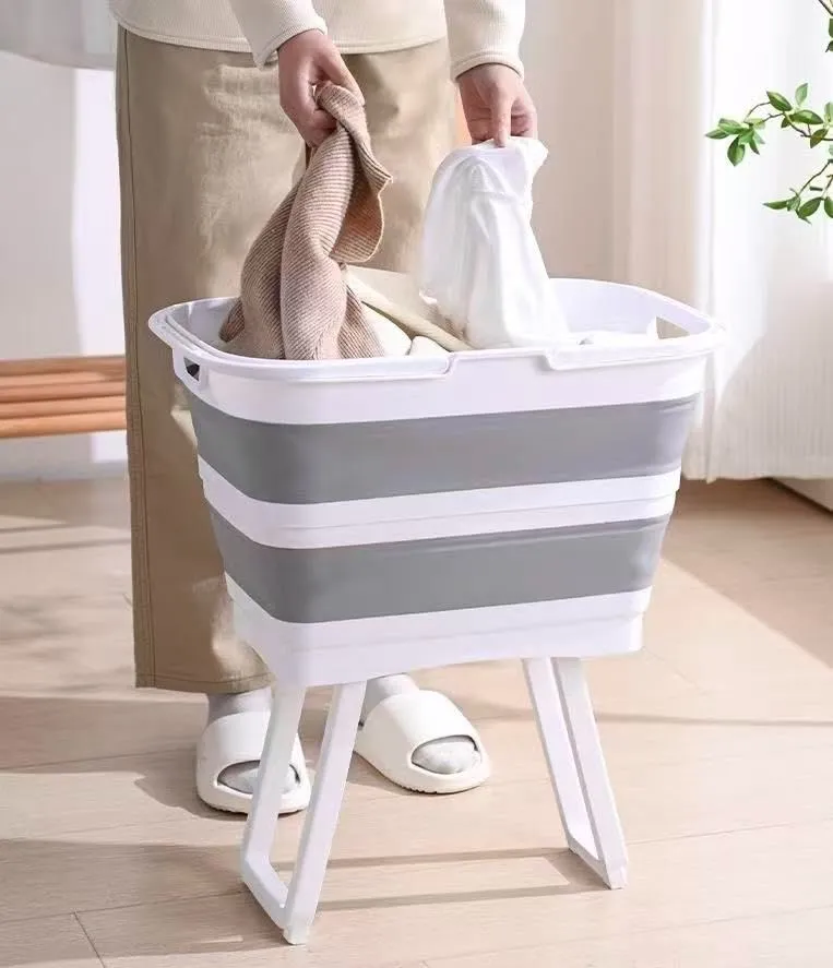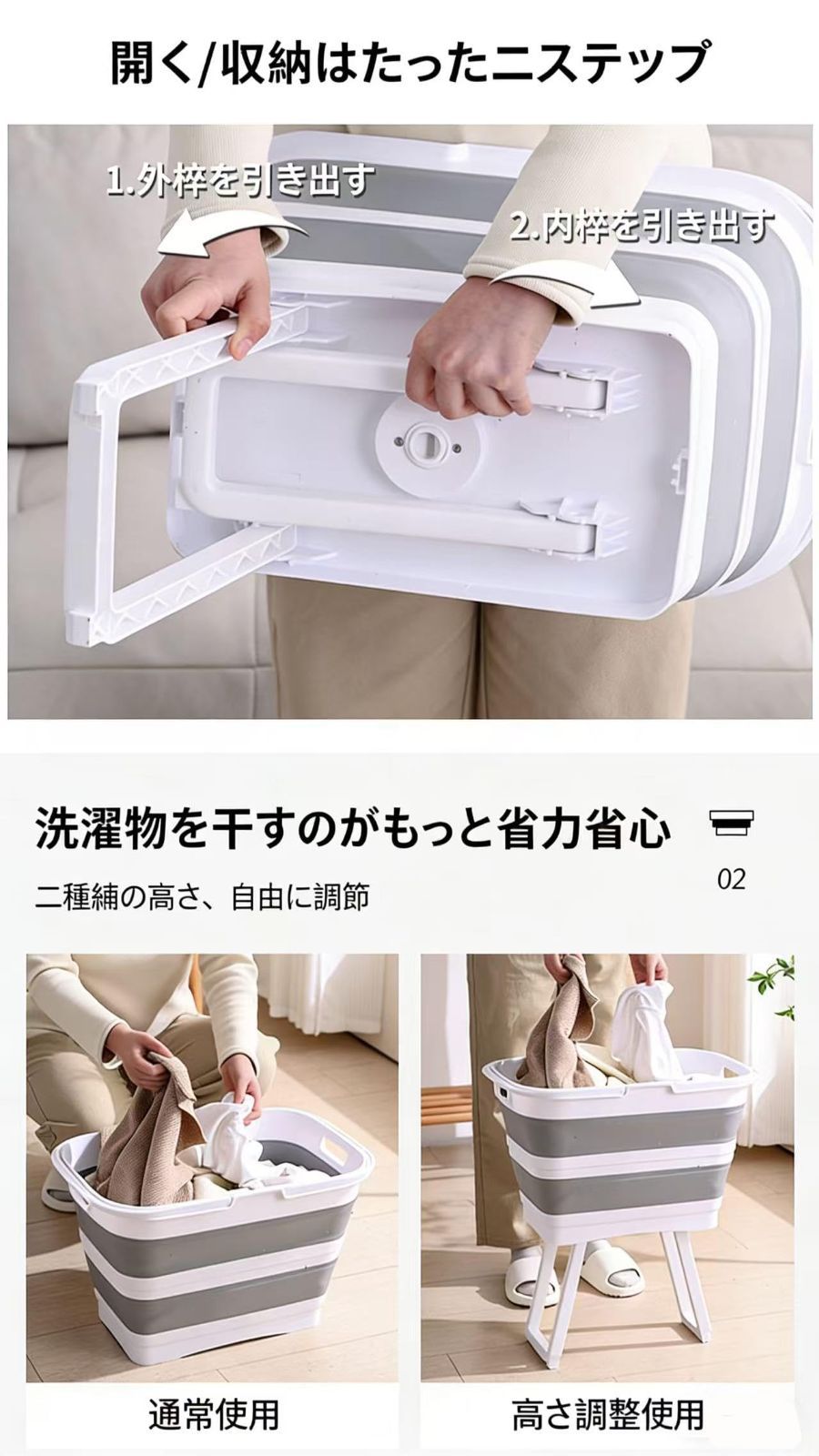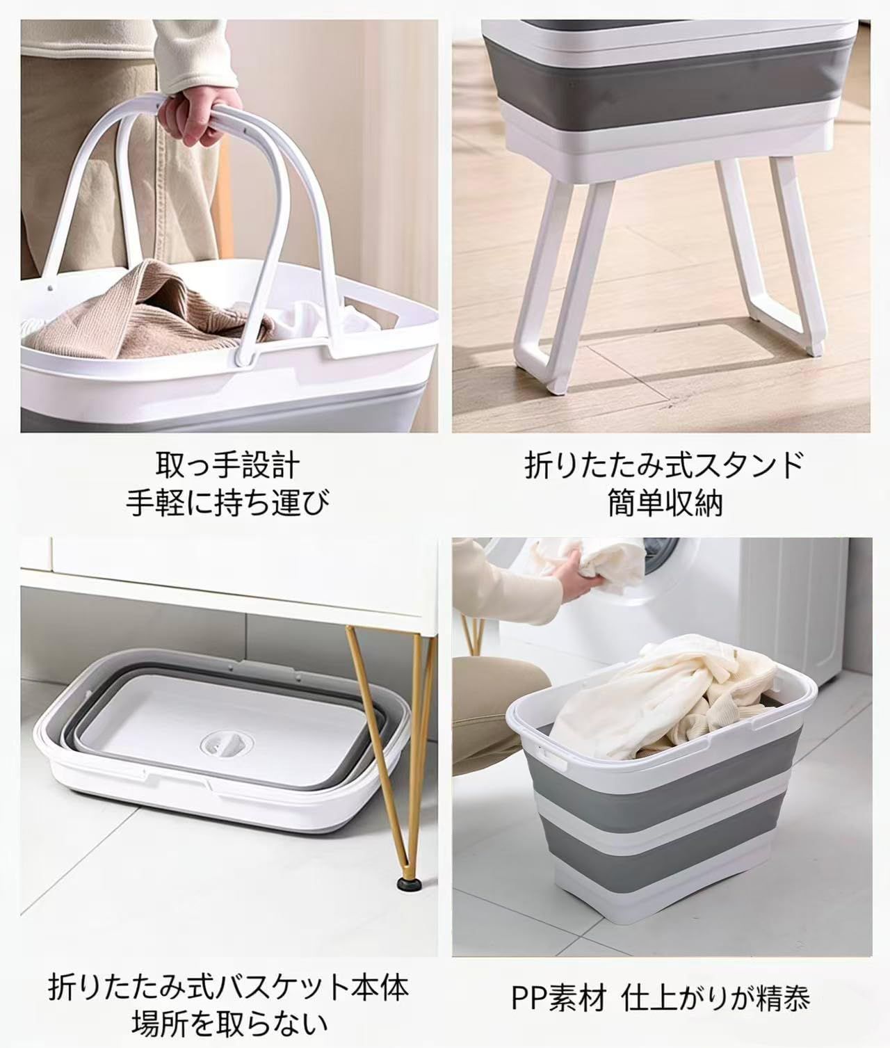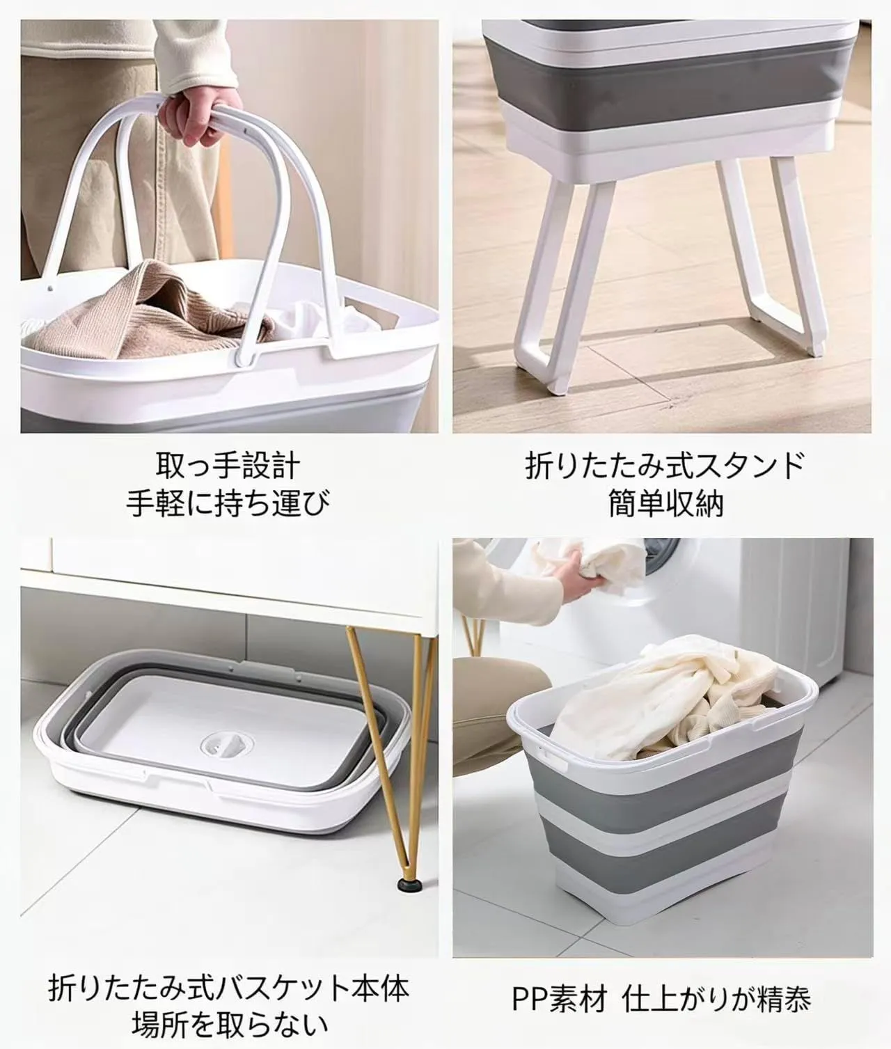 耐久性のある素材: PP+TPR素材を使用し、軽量ながら丈夫で長持ち。グレーとホワイトのストライプデザインで洗濯室やバスルームに馴染むスタイリッシュな外観